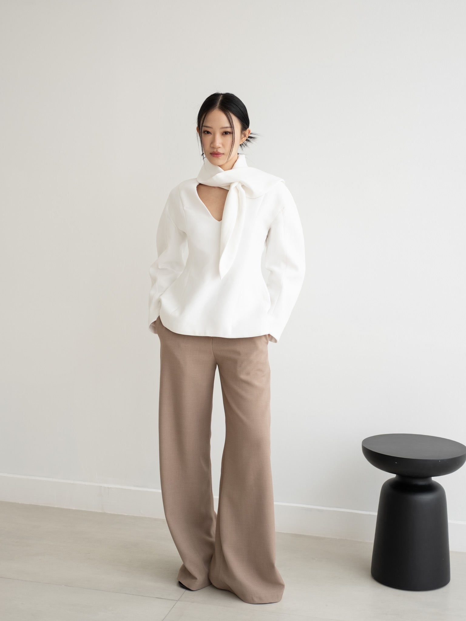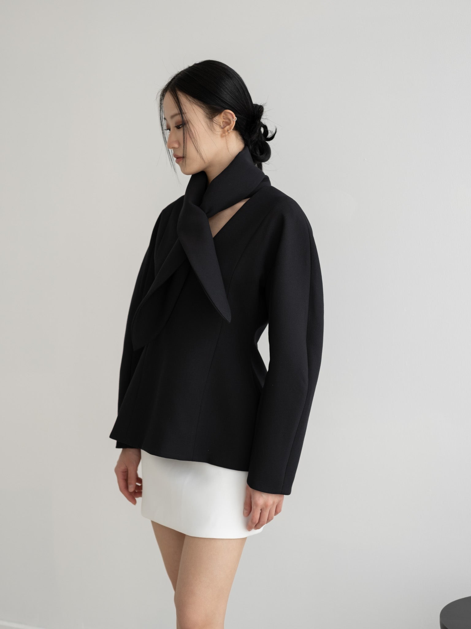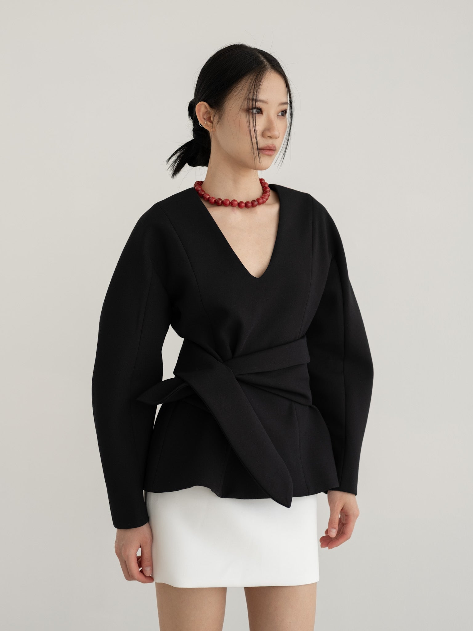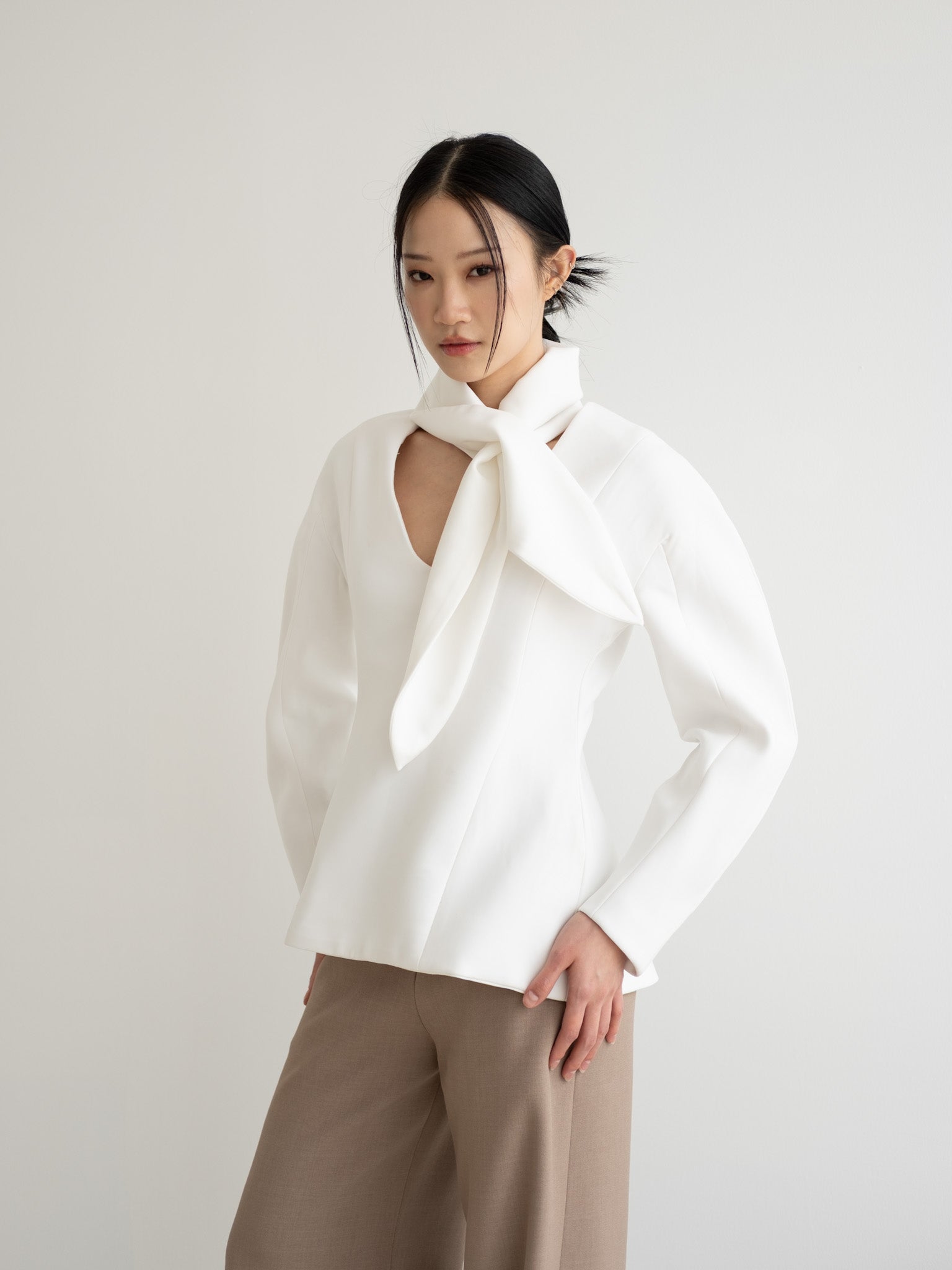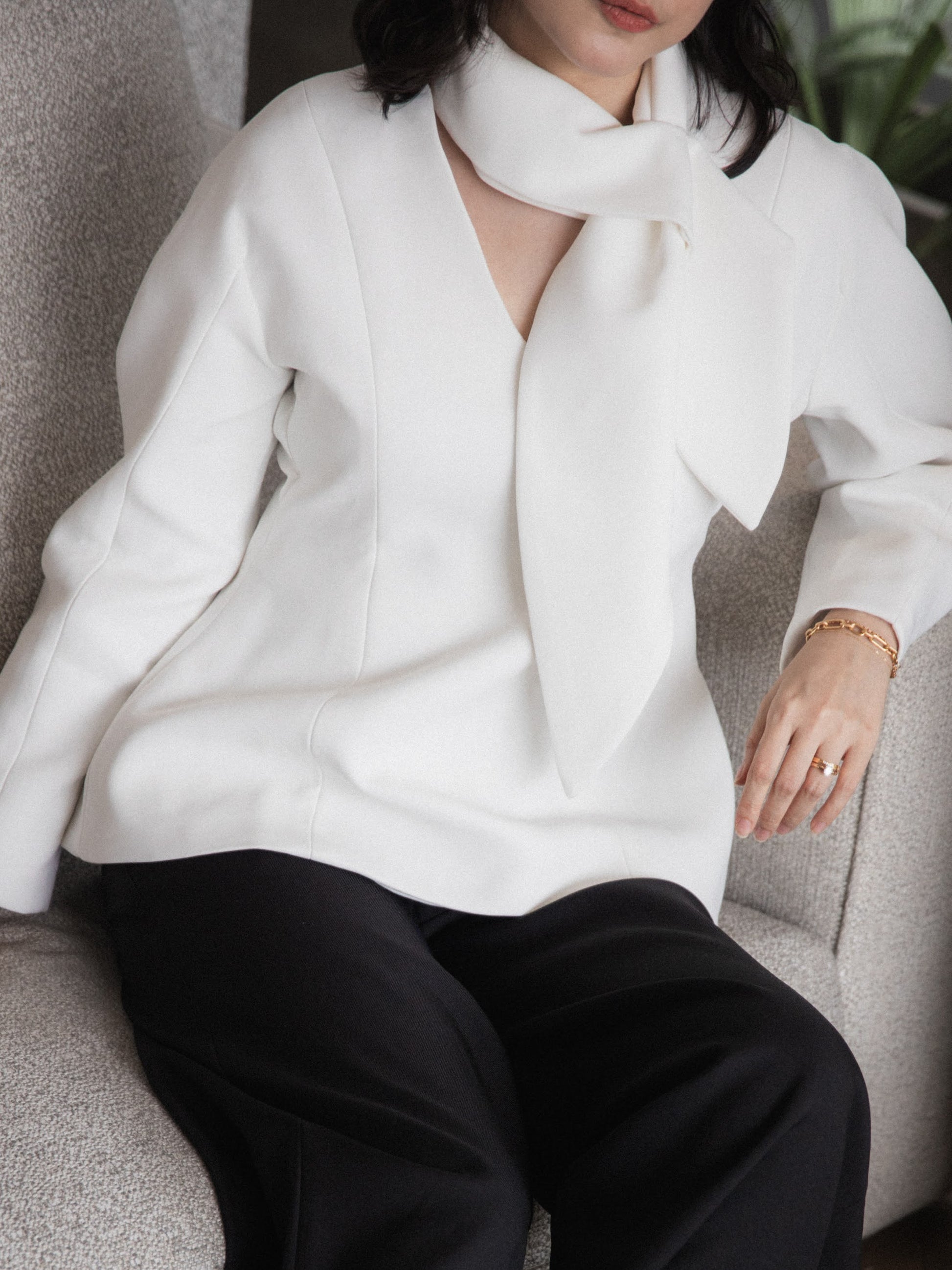 Longsleeve top with a deep V-neckline, peplum waist, and detachable scarf tie.