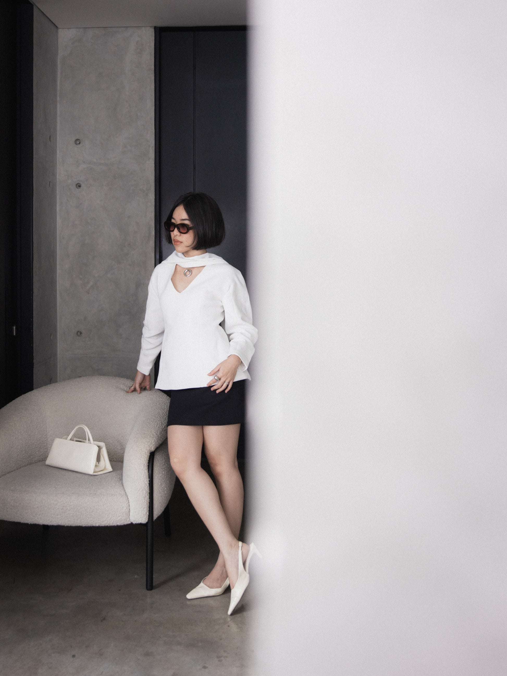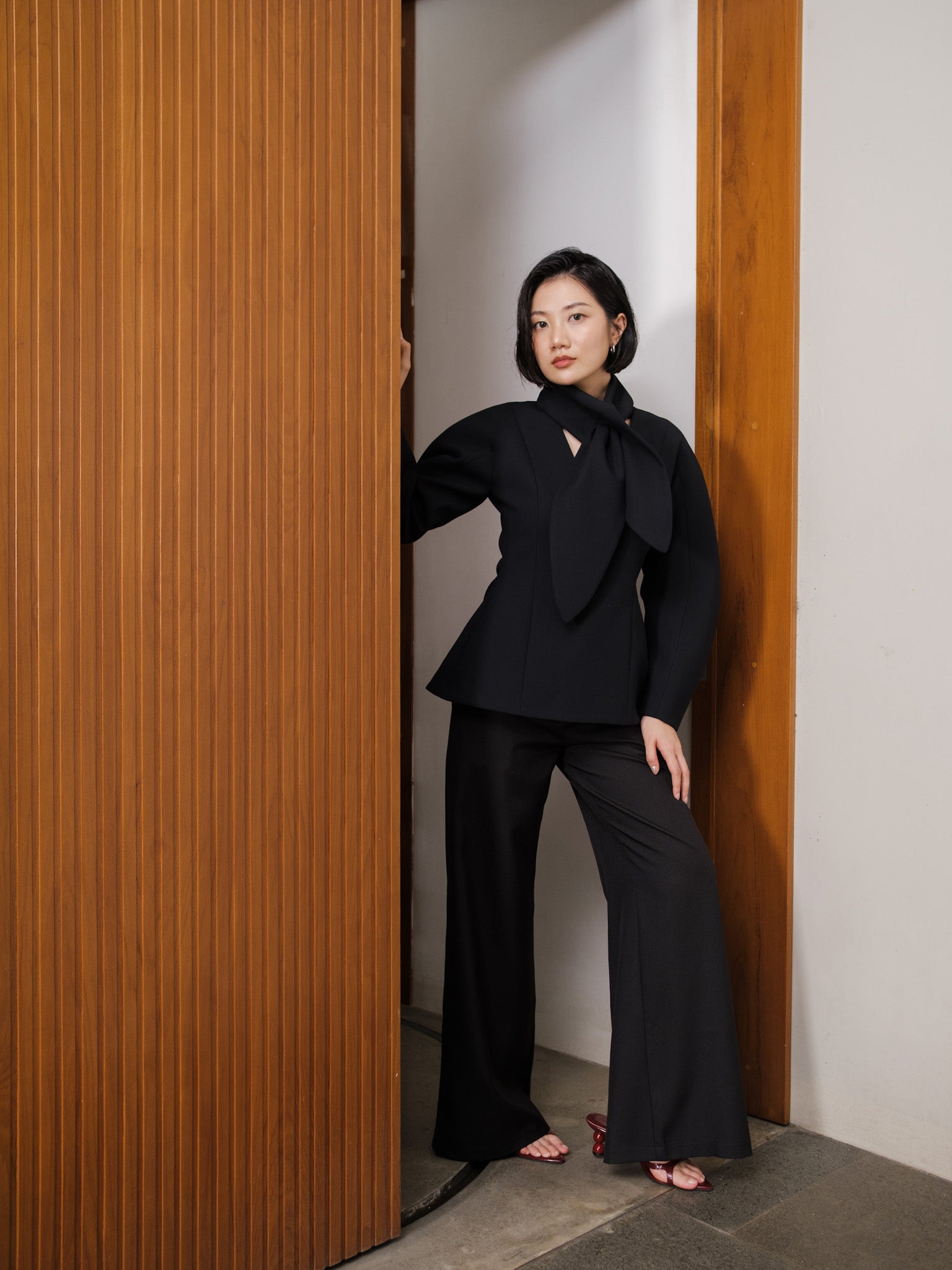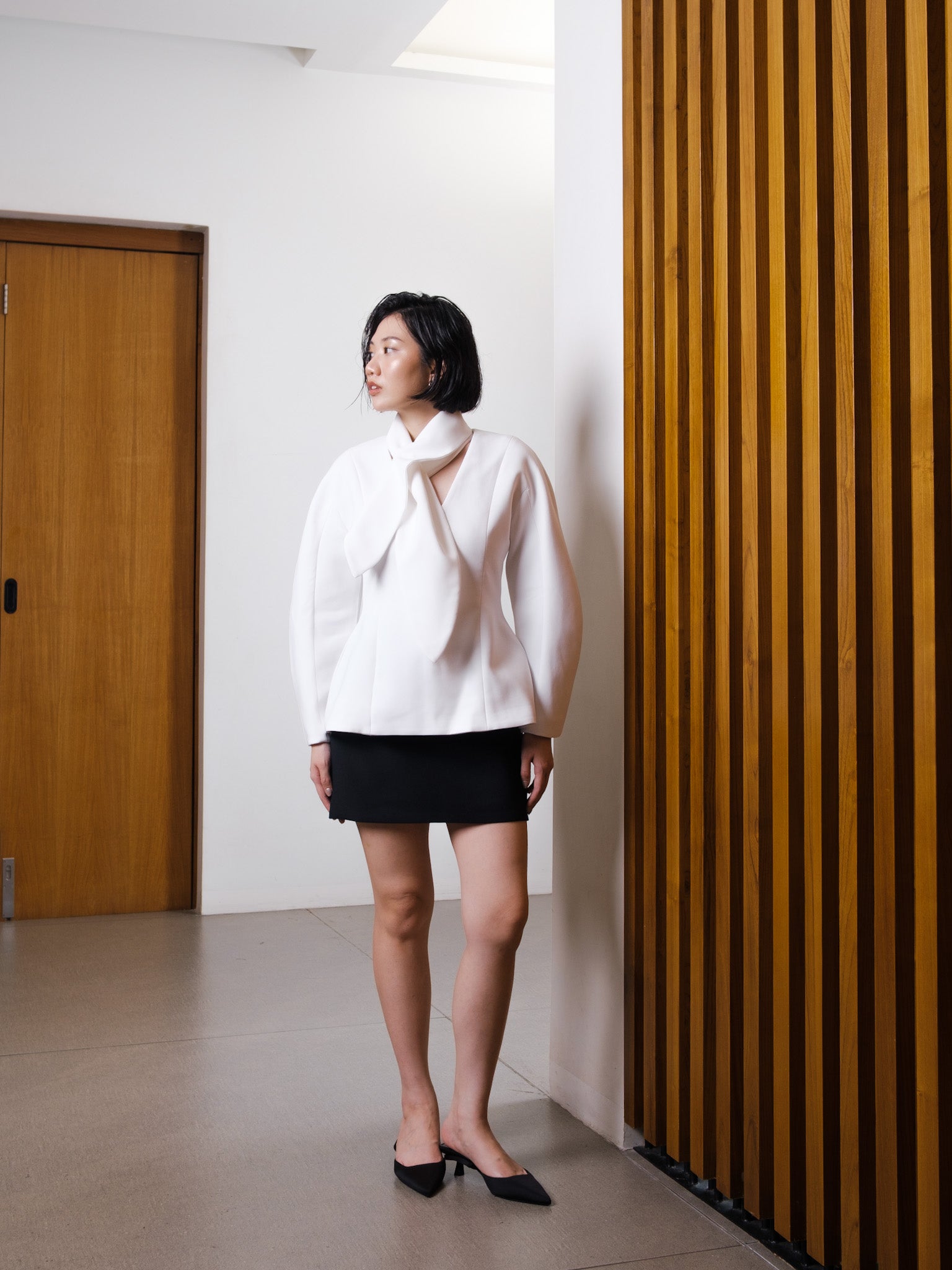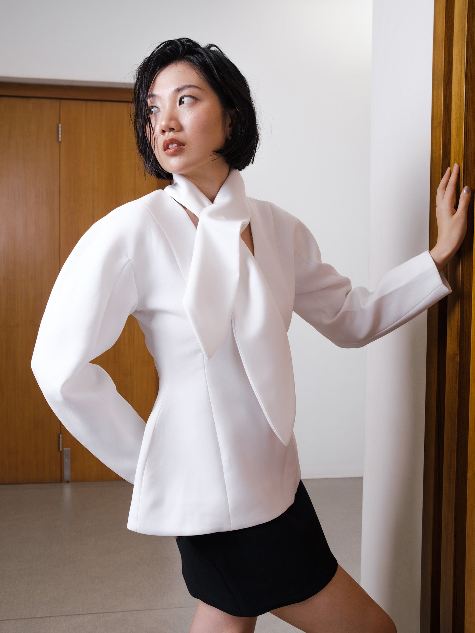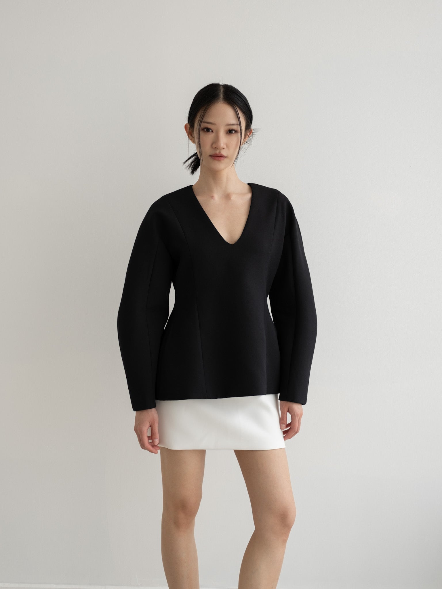 Longsleeve top with a deep V-neckline, peplum waist, and detachable scarf tie.