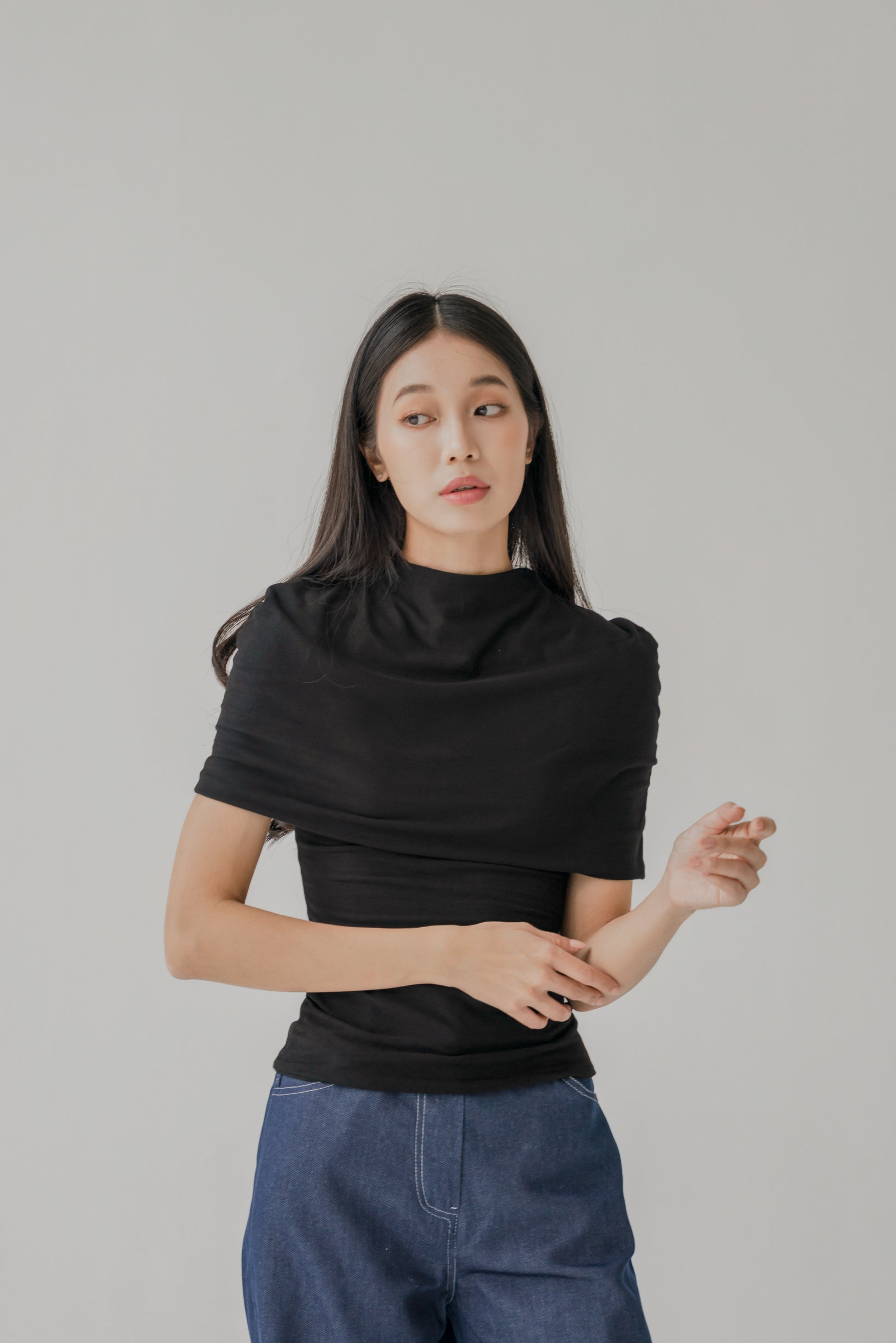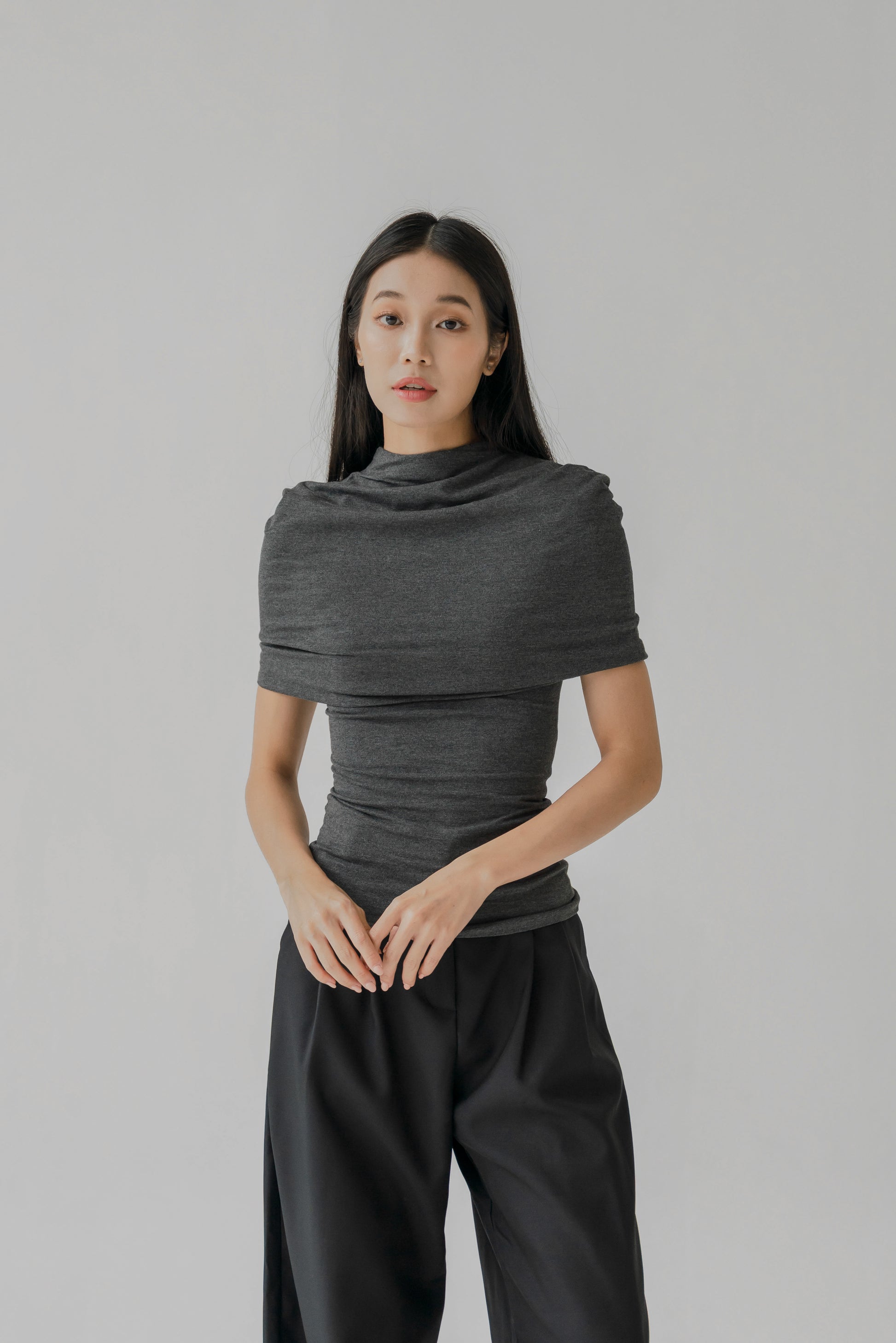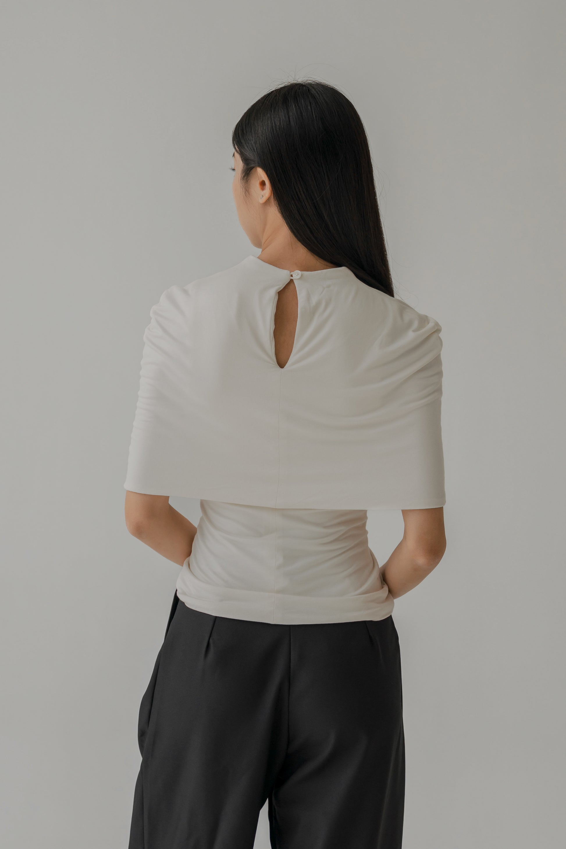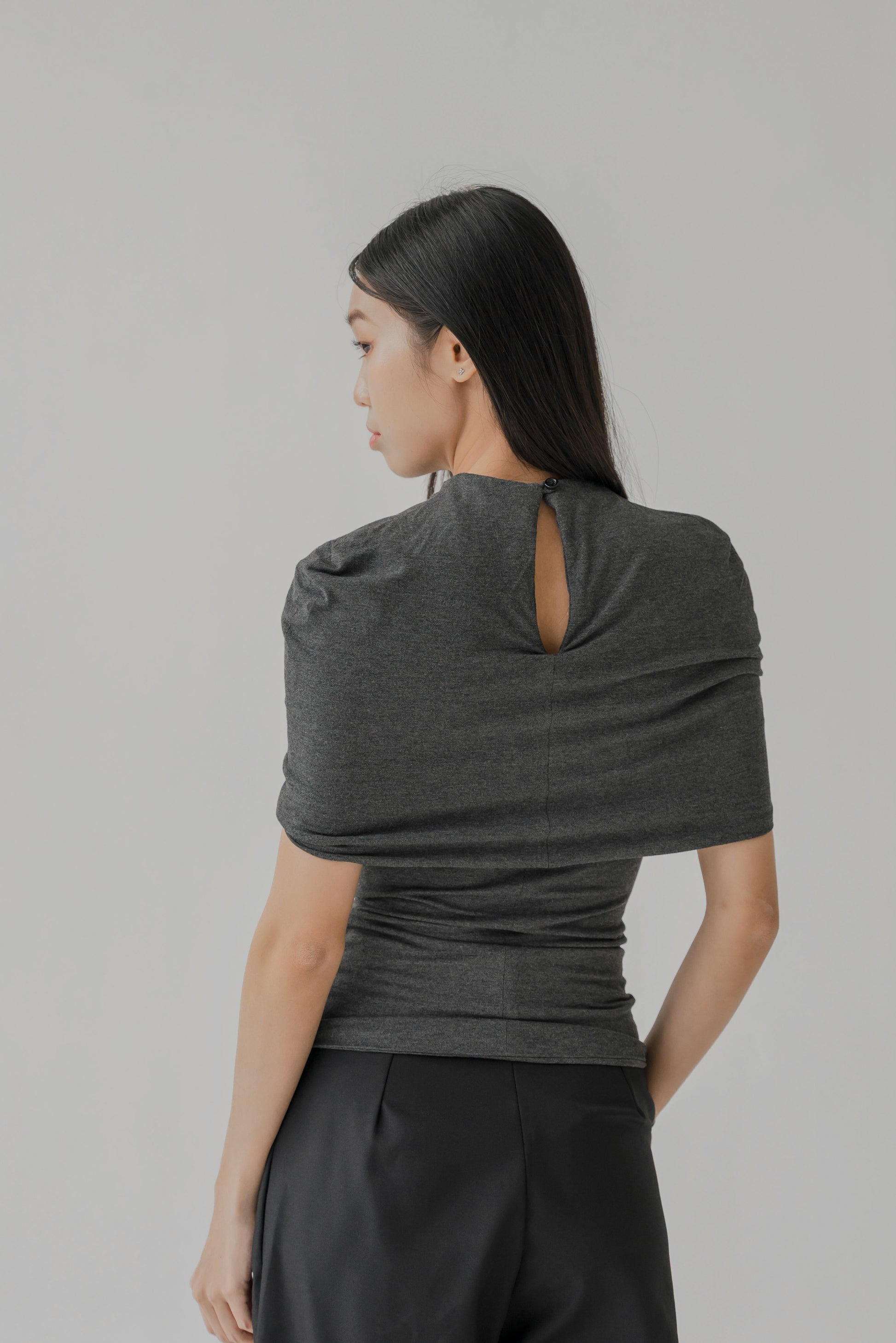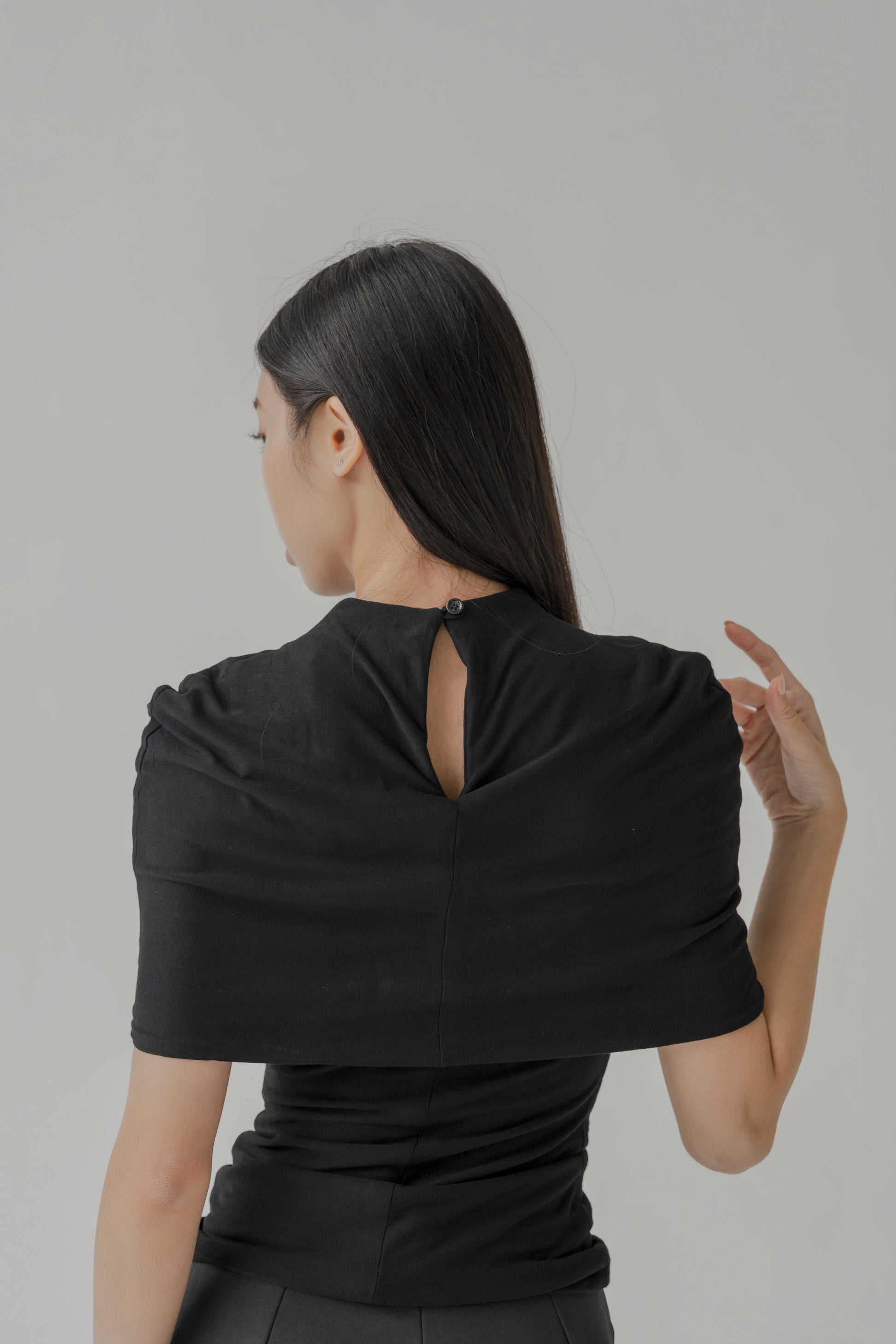 Fit top with draped cape detail, featuring a high neckline and keyhole back closure.