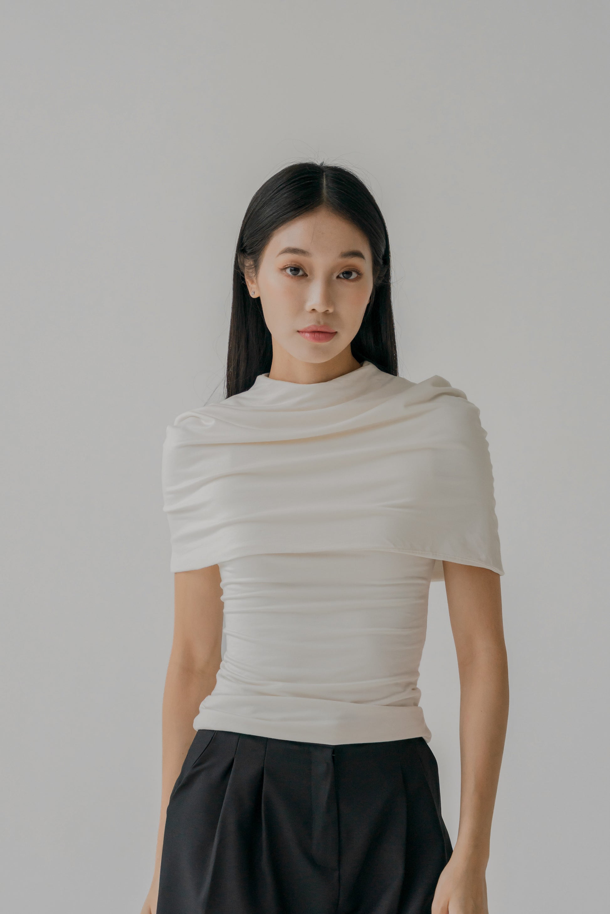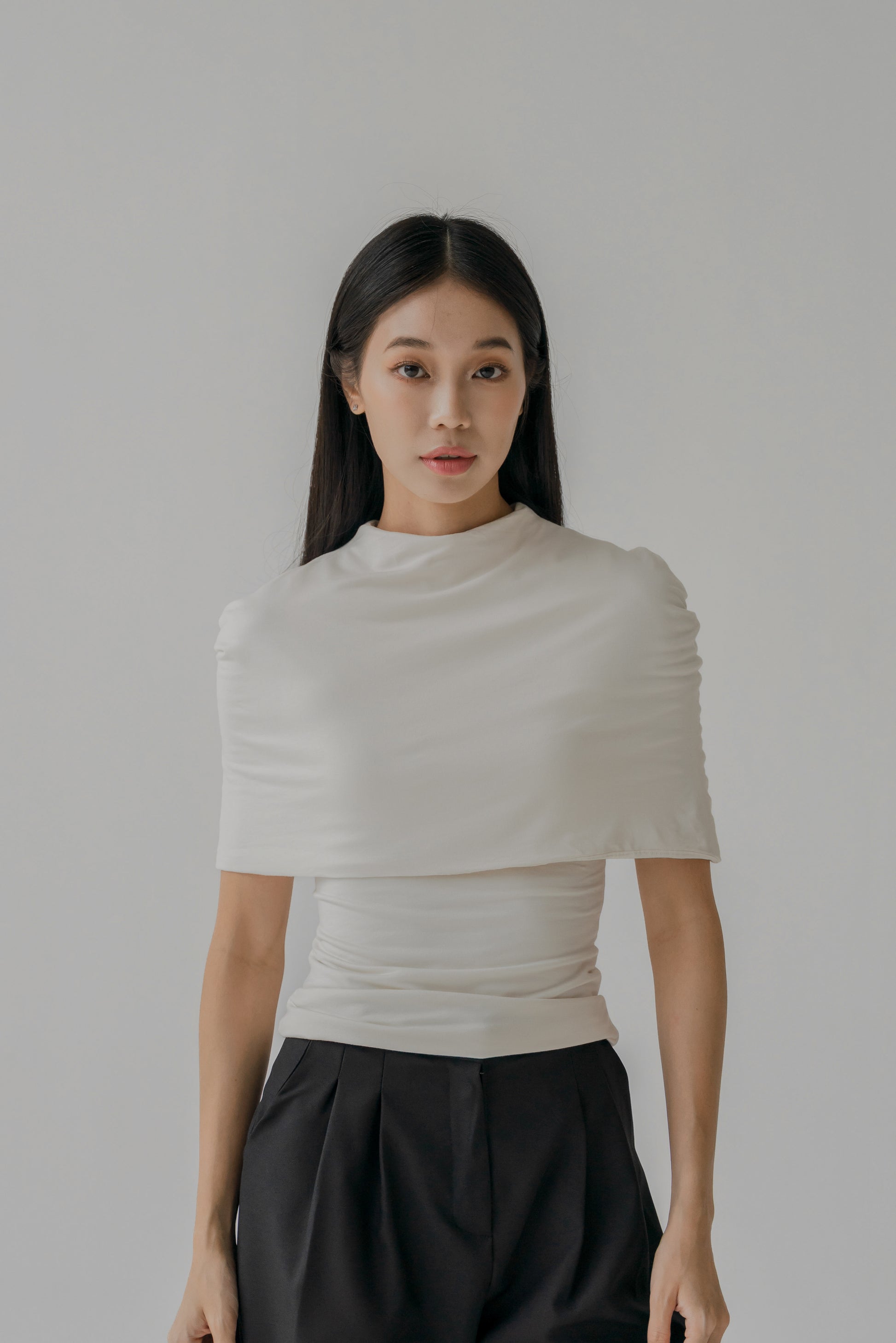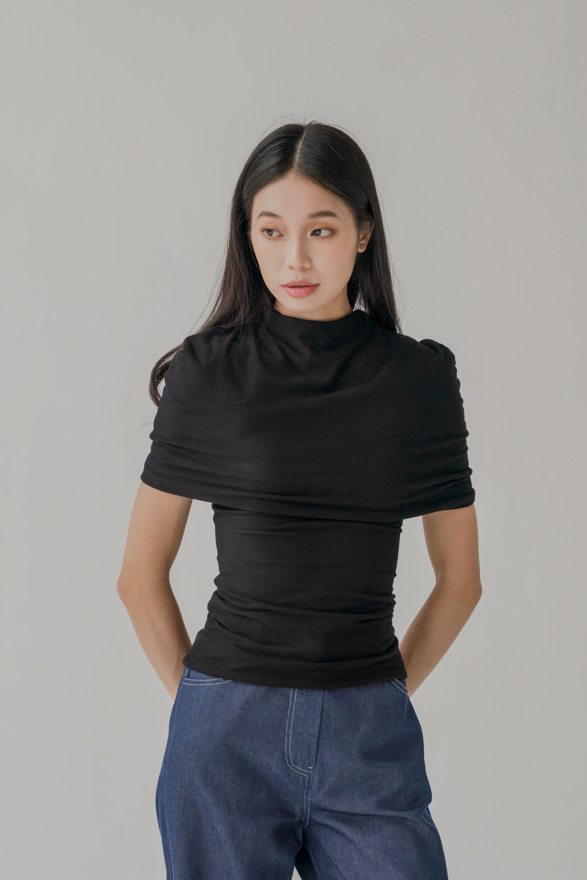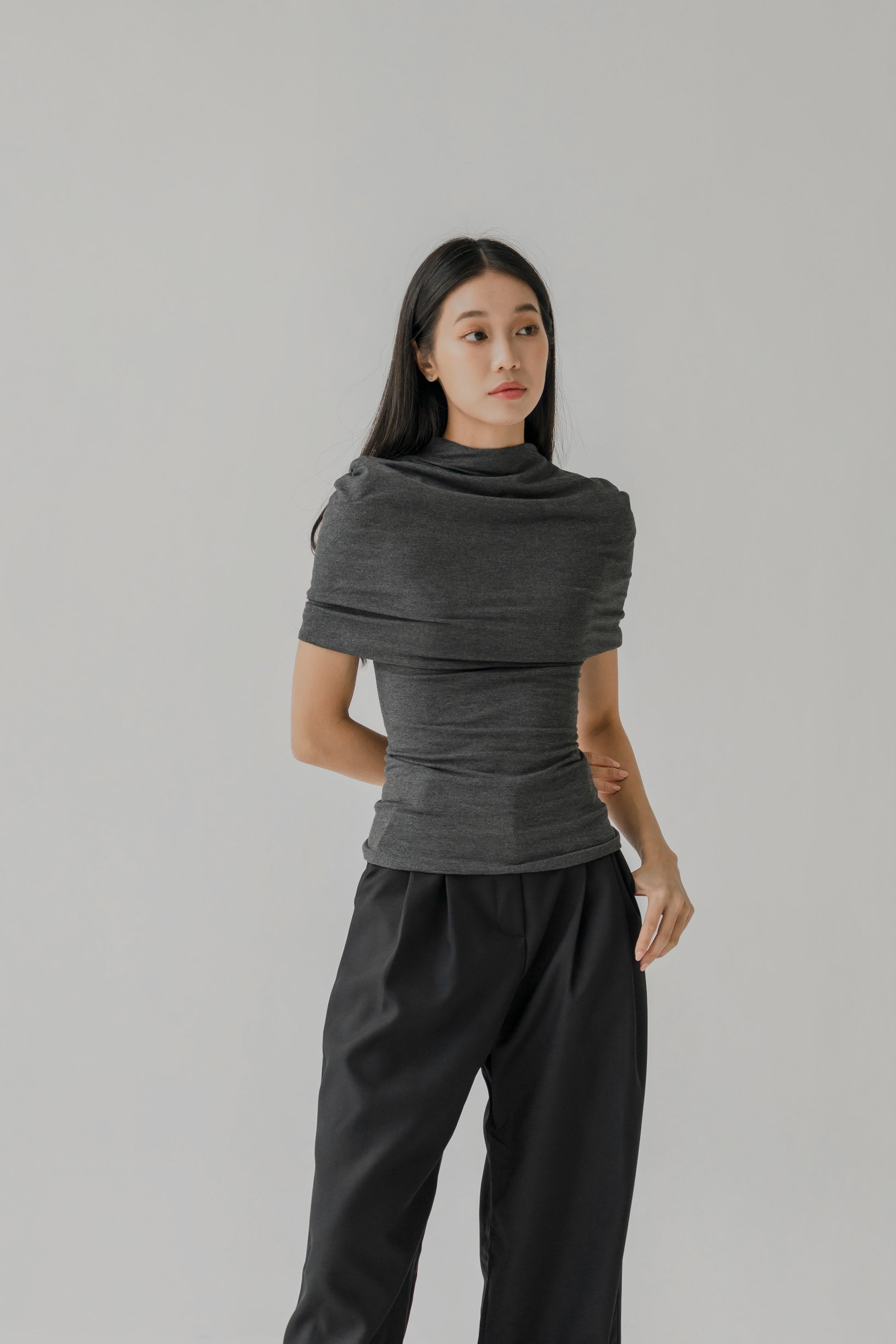Fit top with draped cape detail, featuring a high neckline and keyhole back closure.