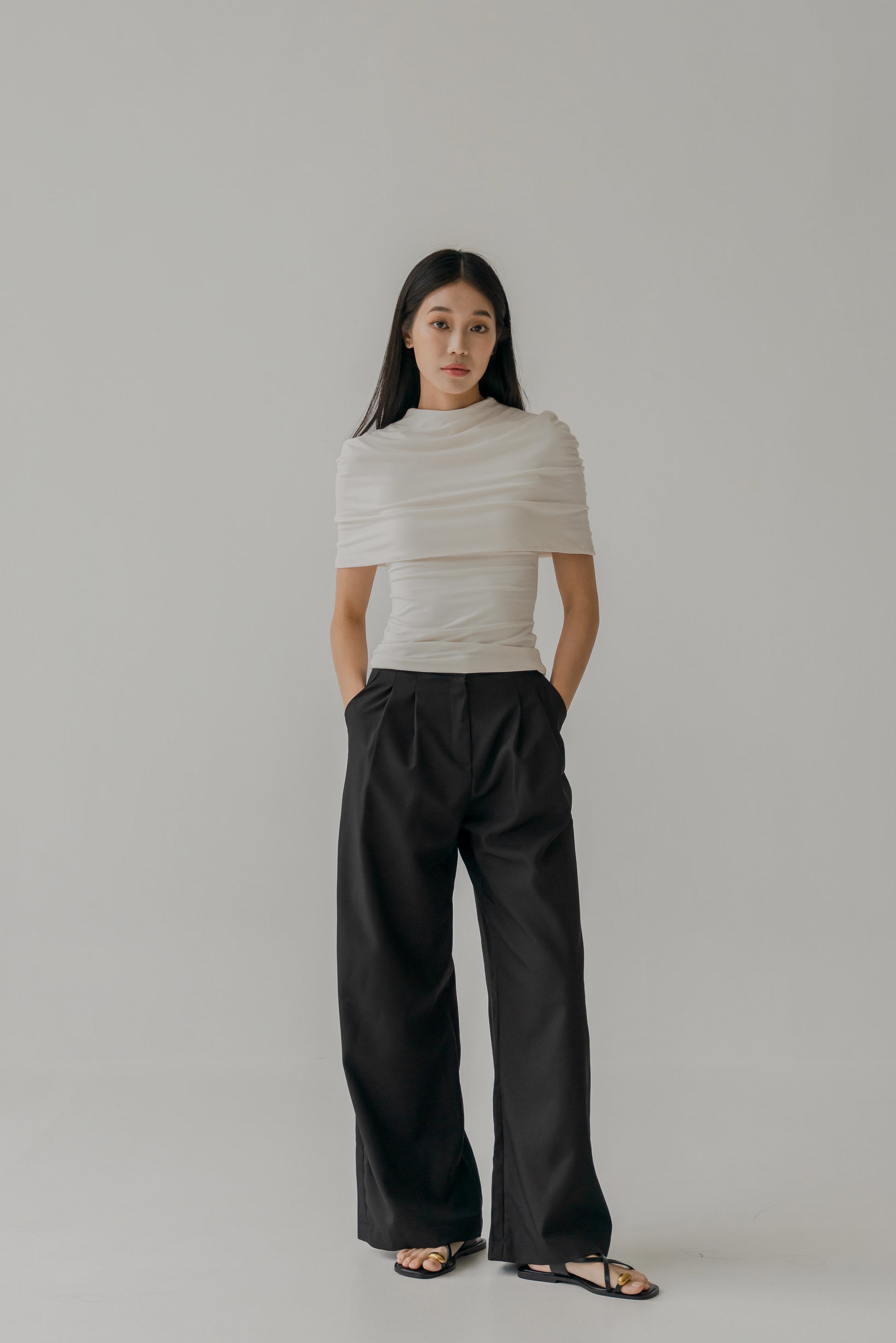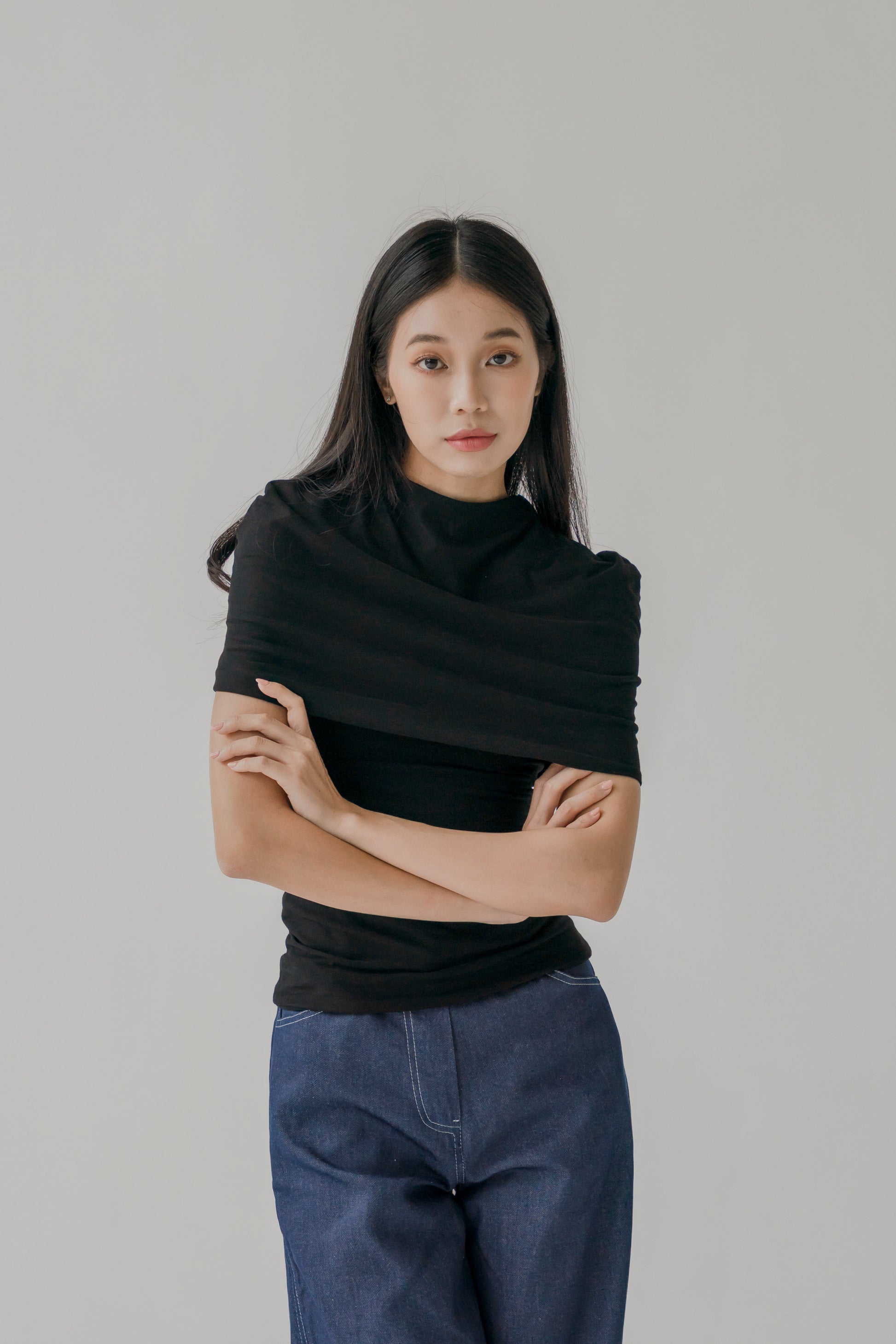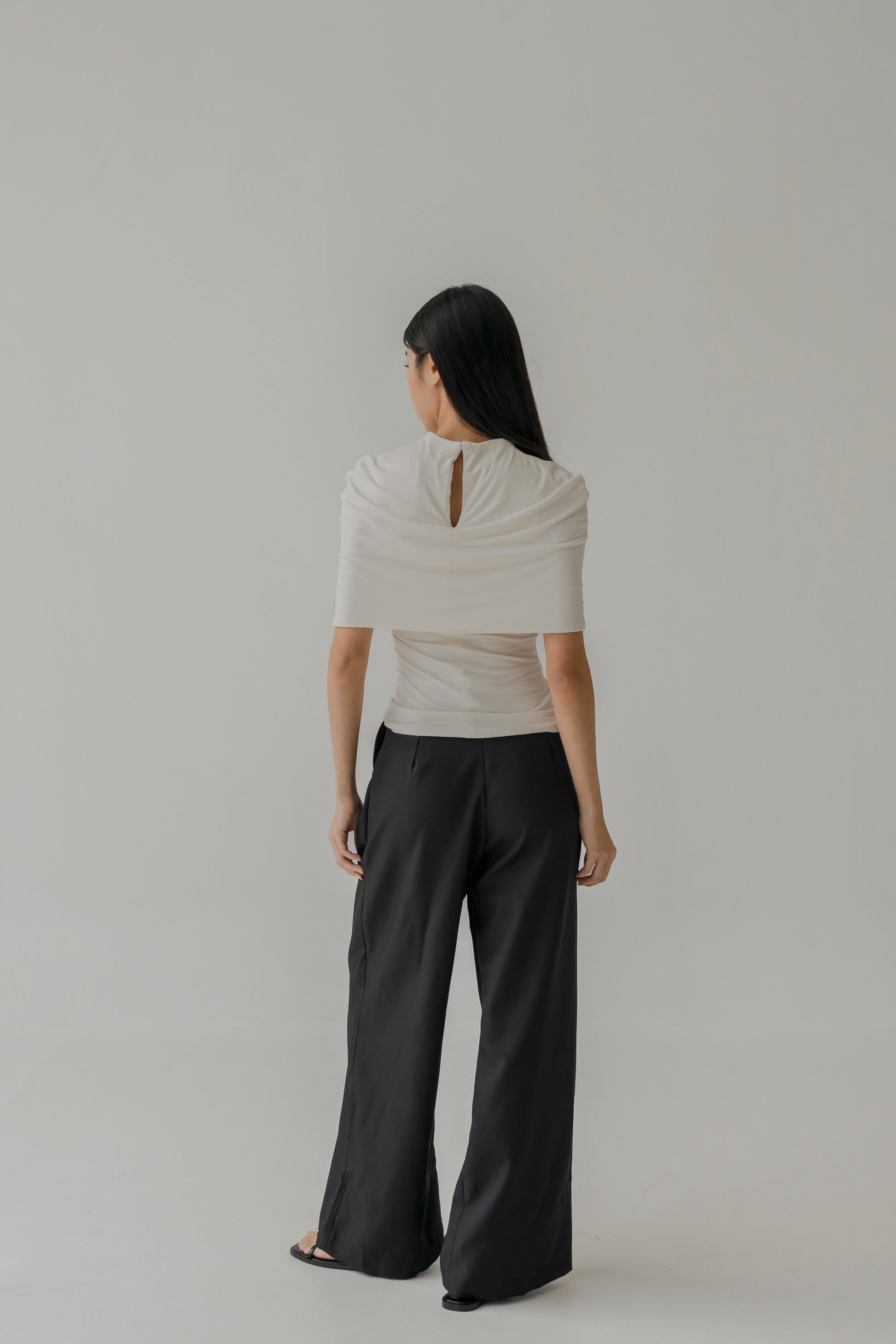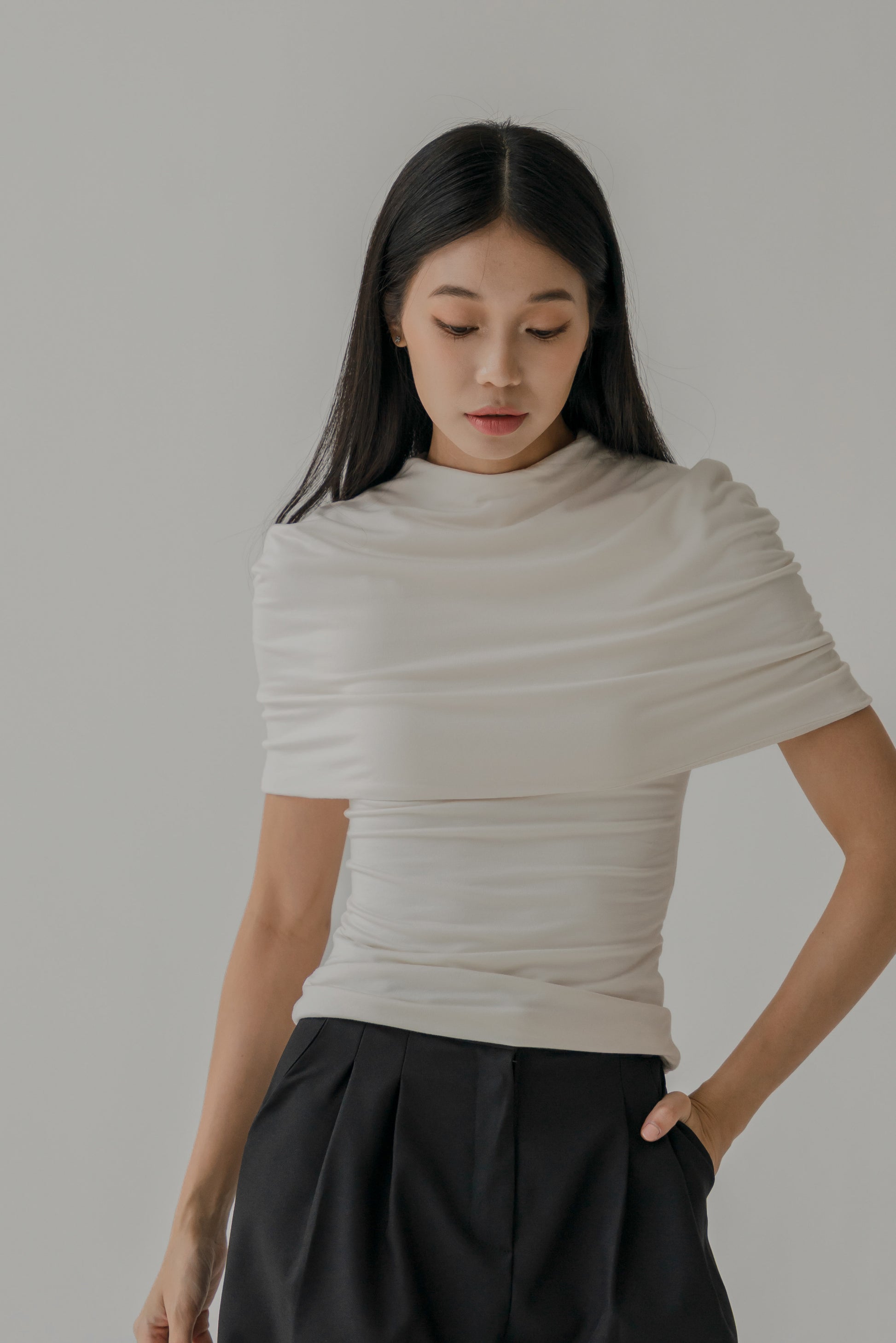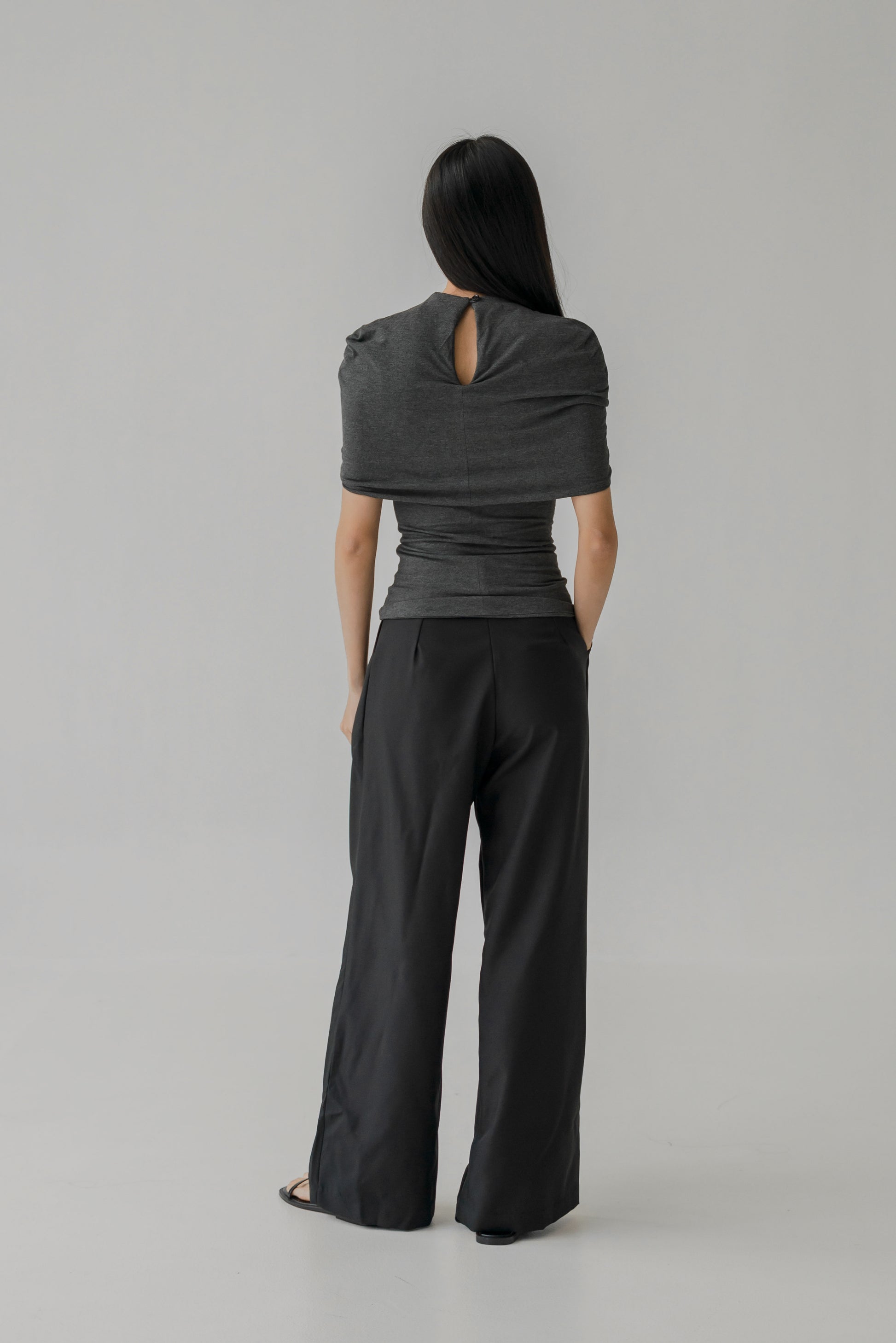 Fit top with draped cape detail, featuring a high neckline and keyhole back closure.