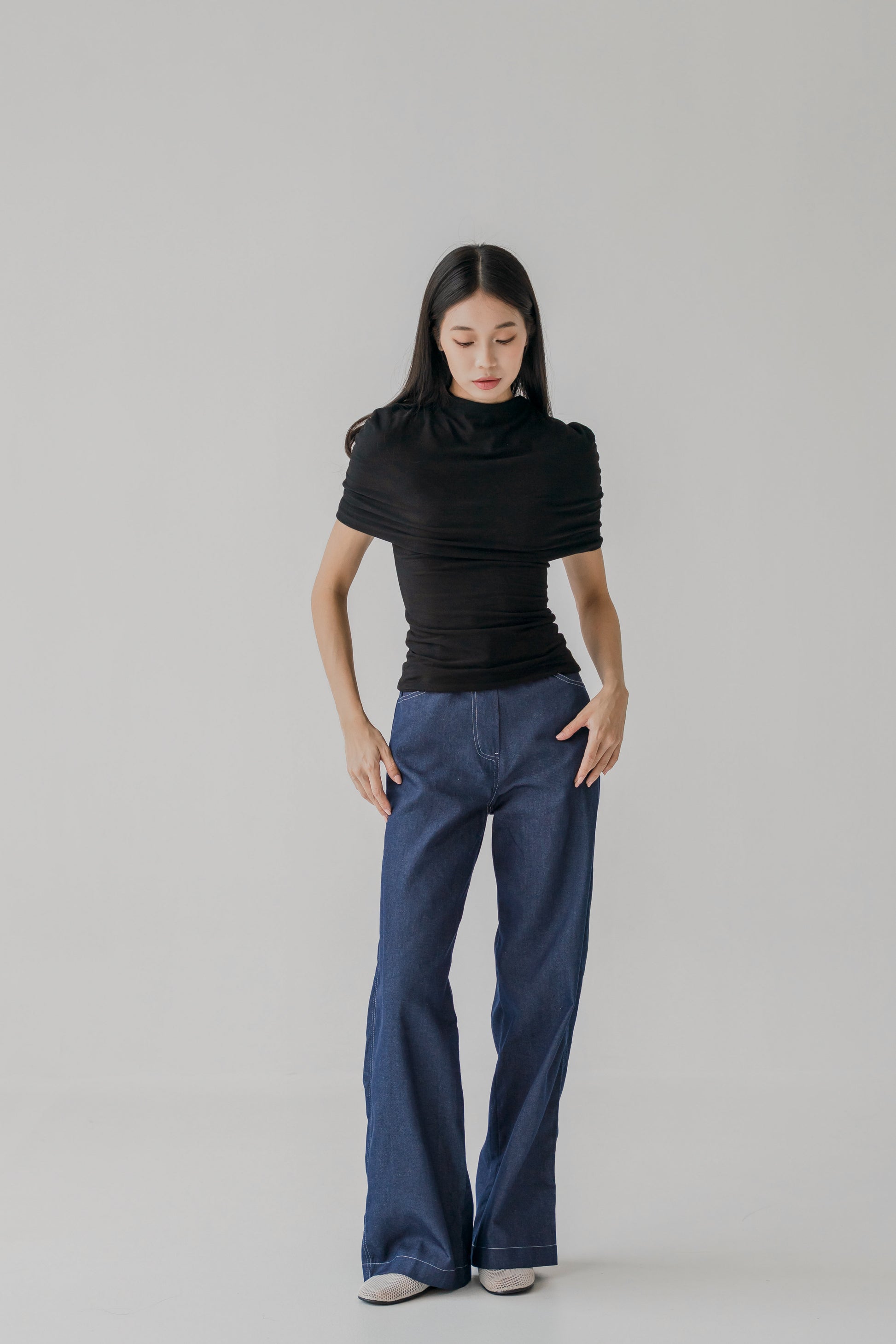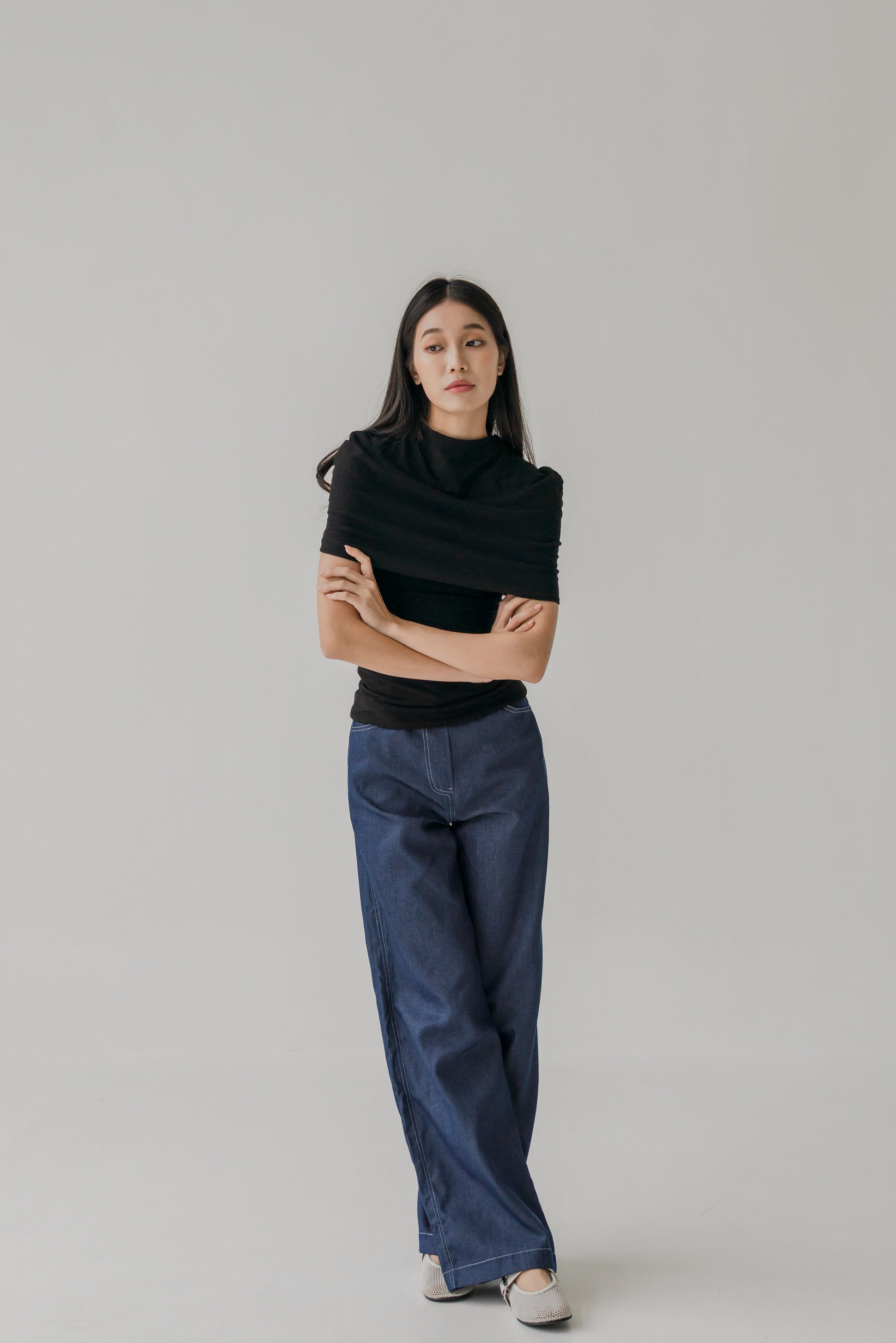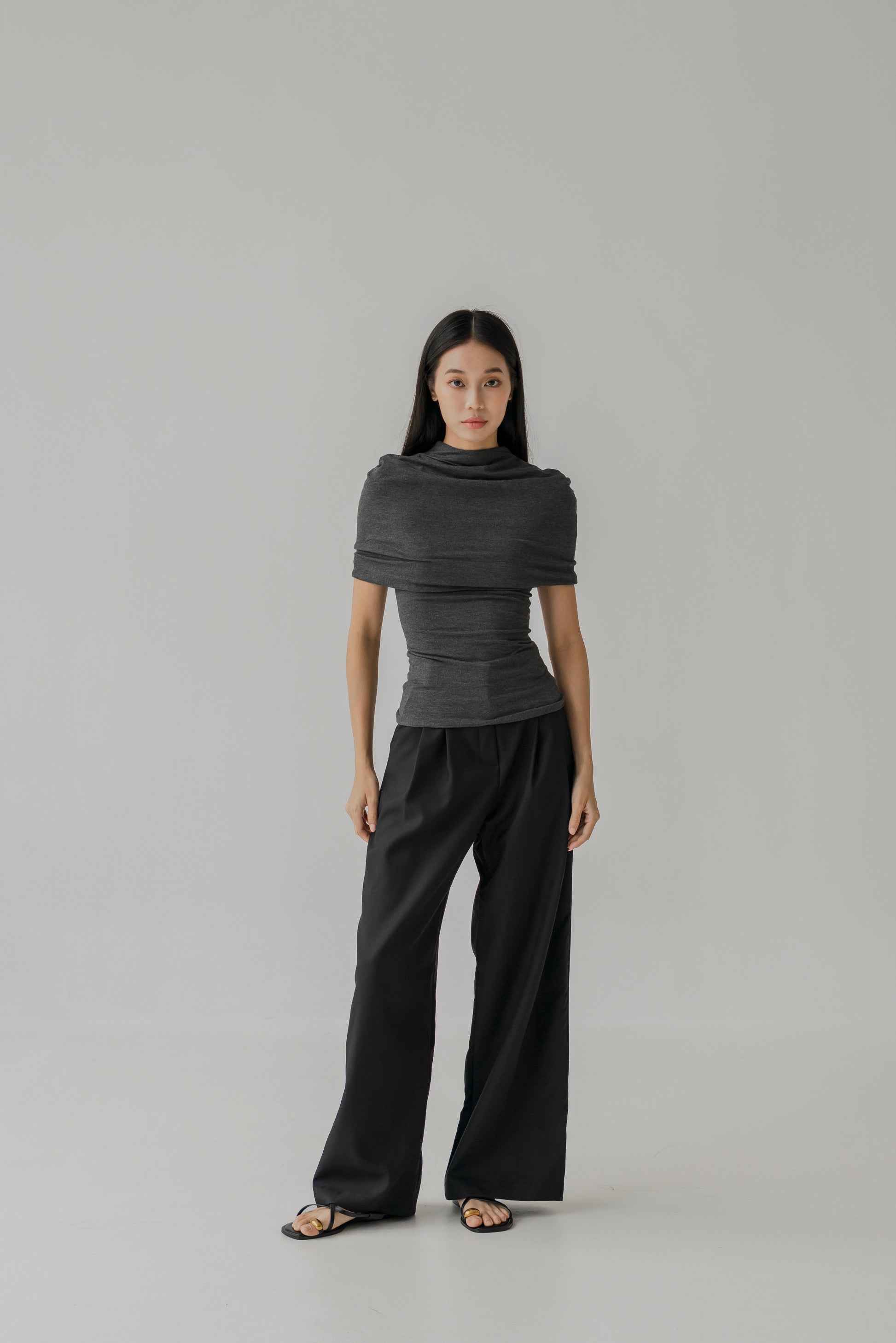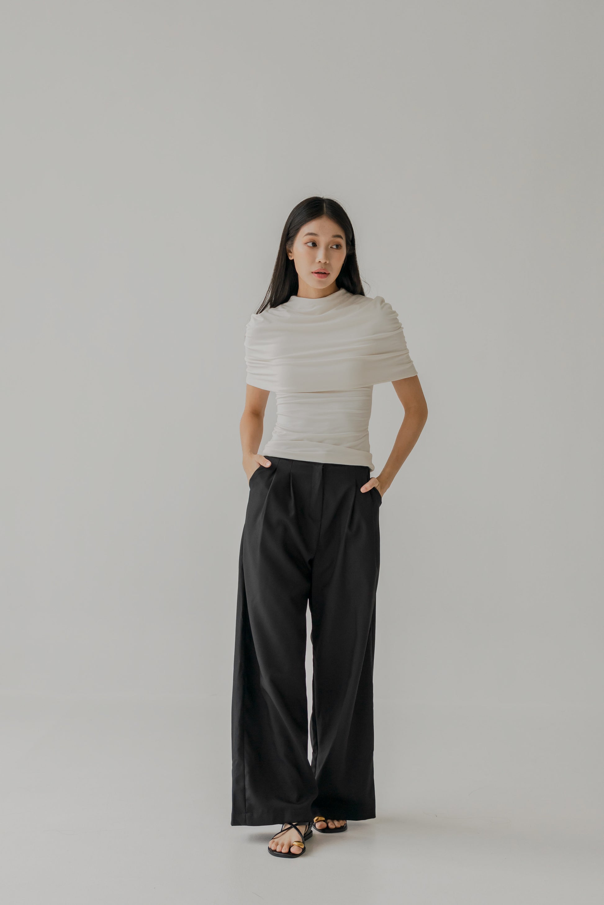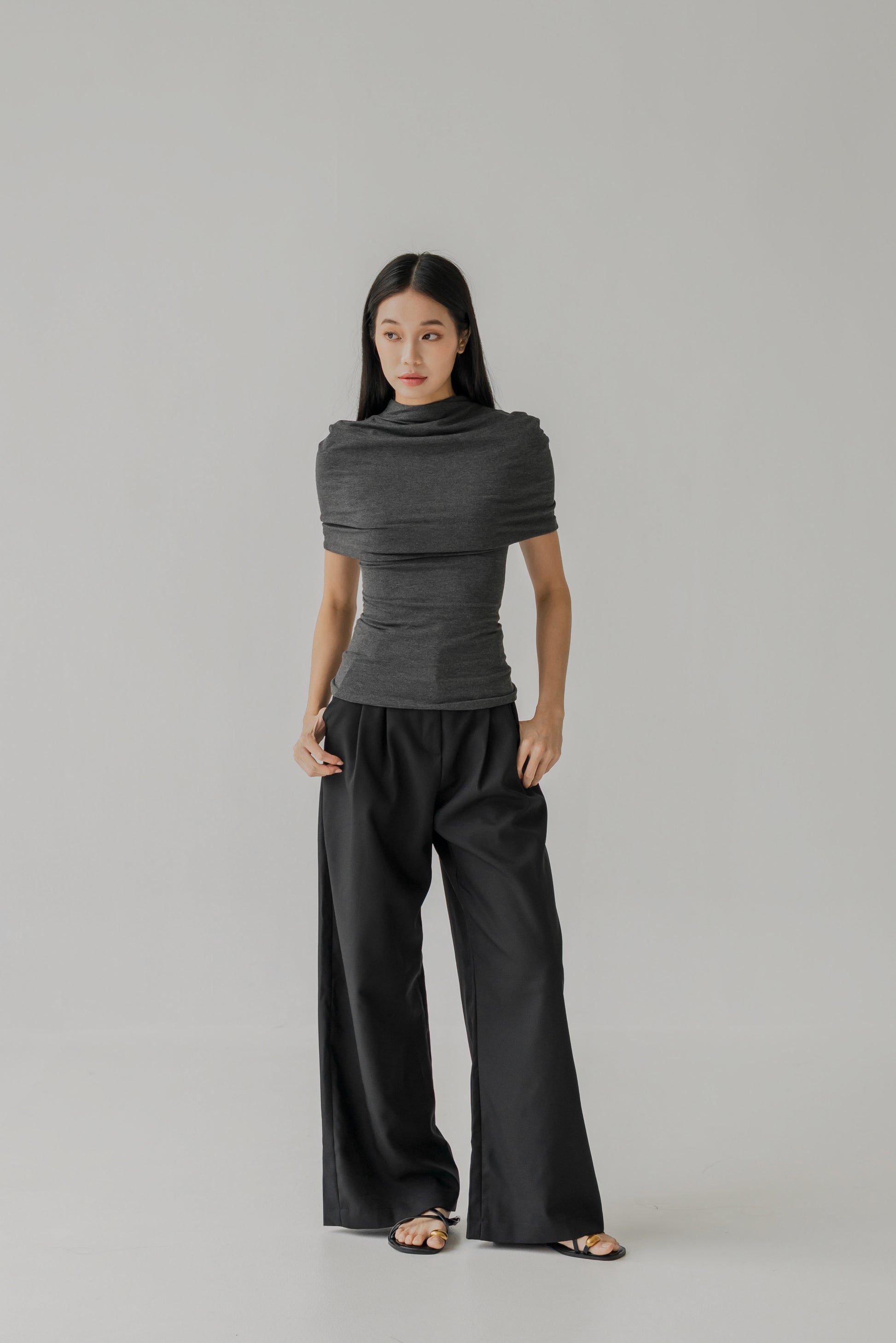 Fit top with draped cape detail, featuring a high neckline and keyhole back closure.