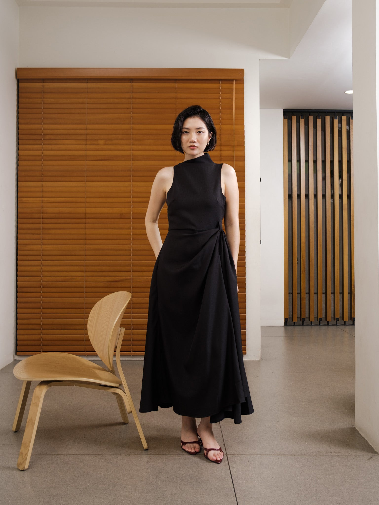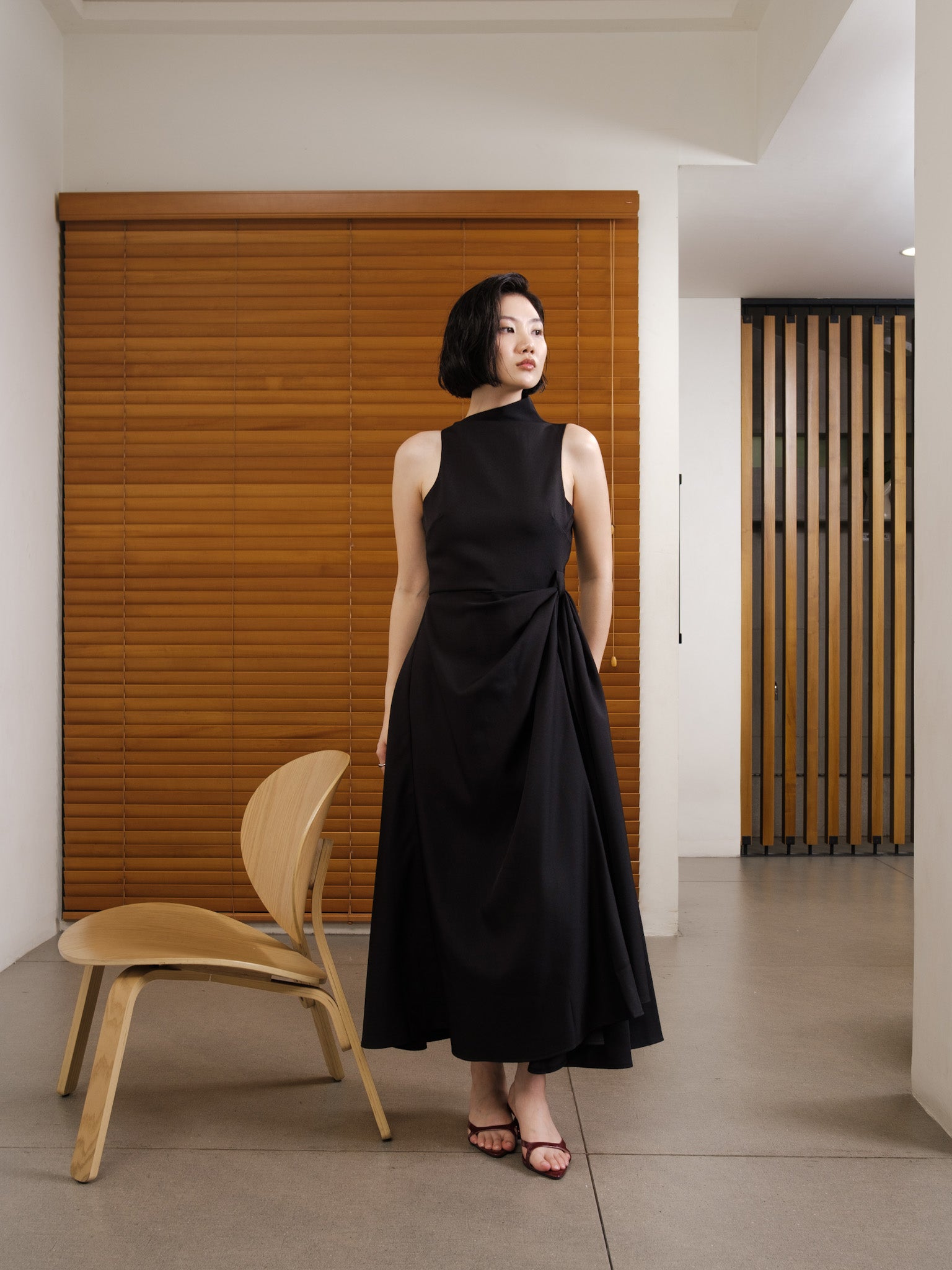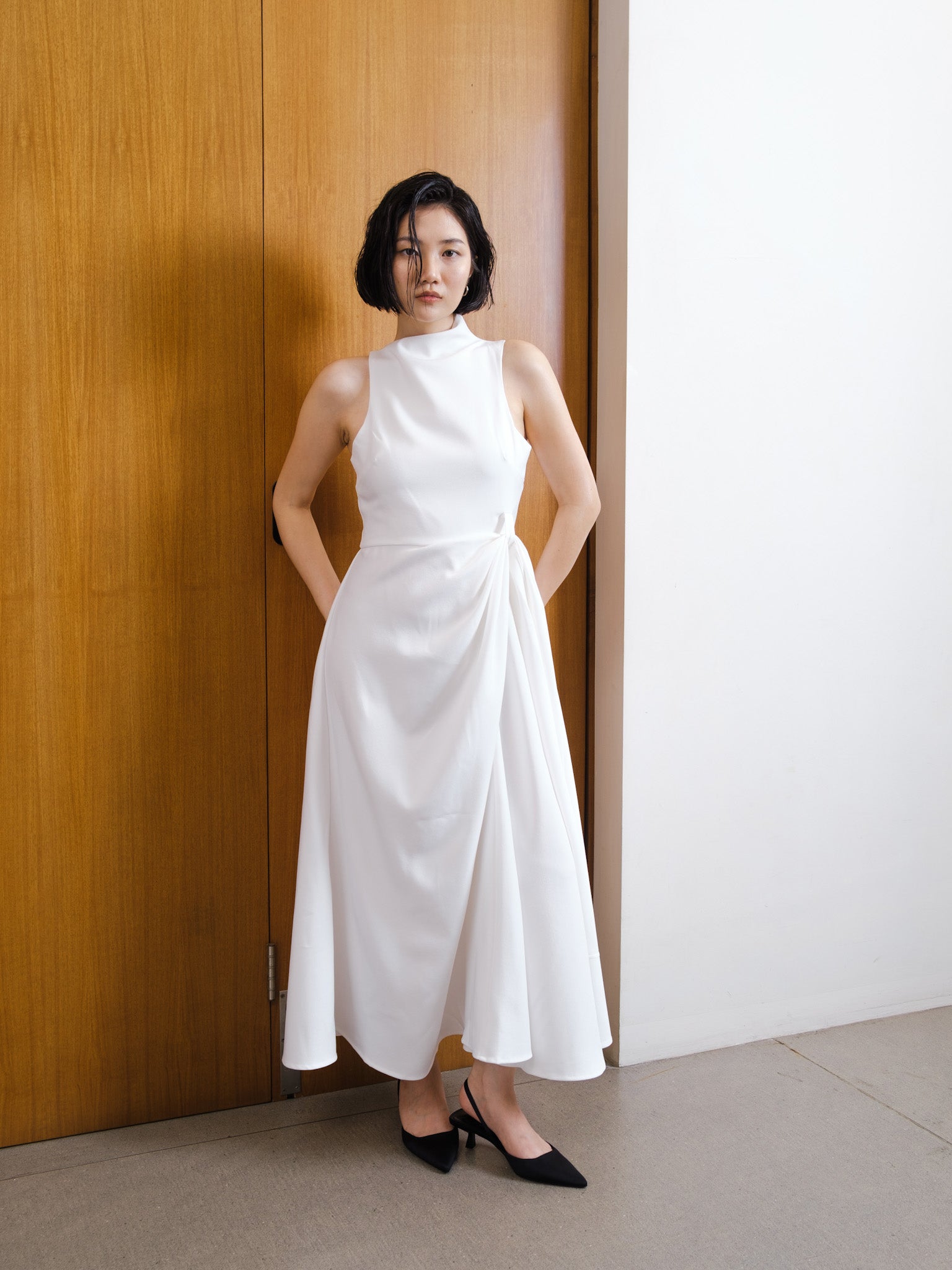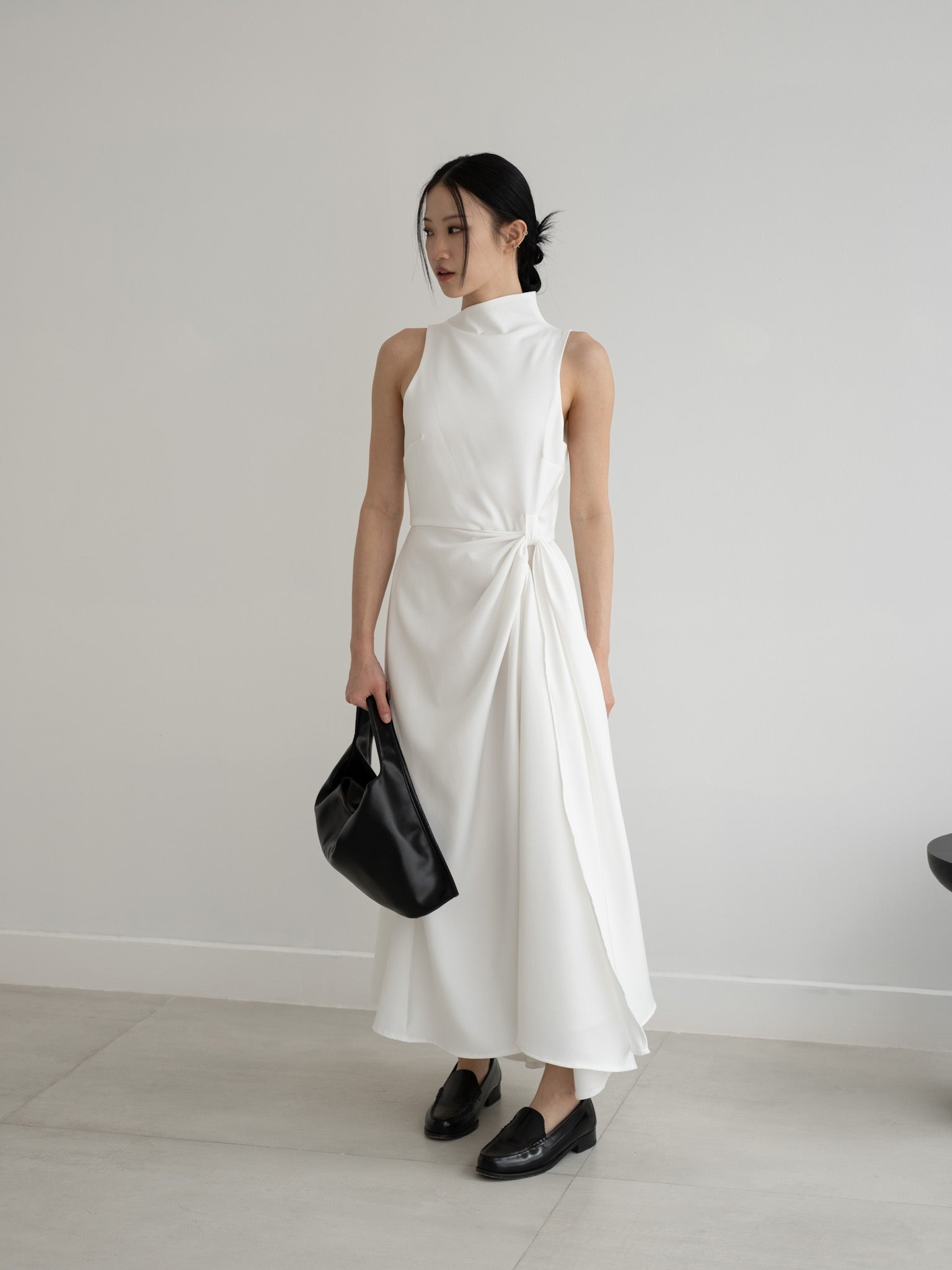 Sleeveless midi dress with high collar, side skirt drape detail, and flared hemline