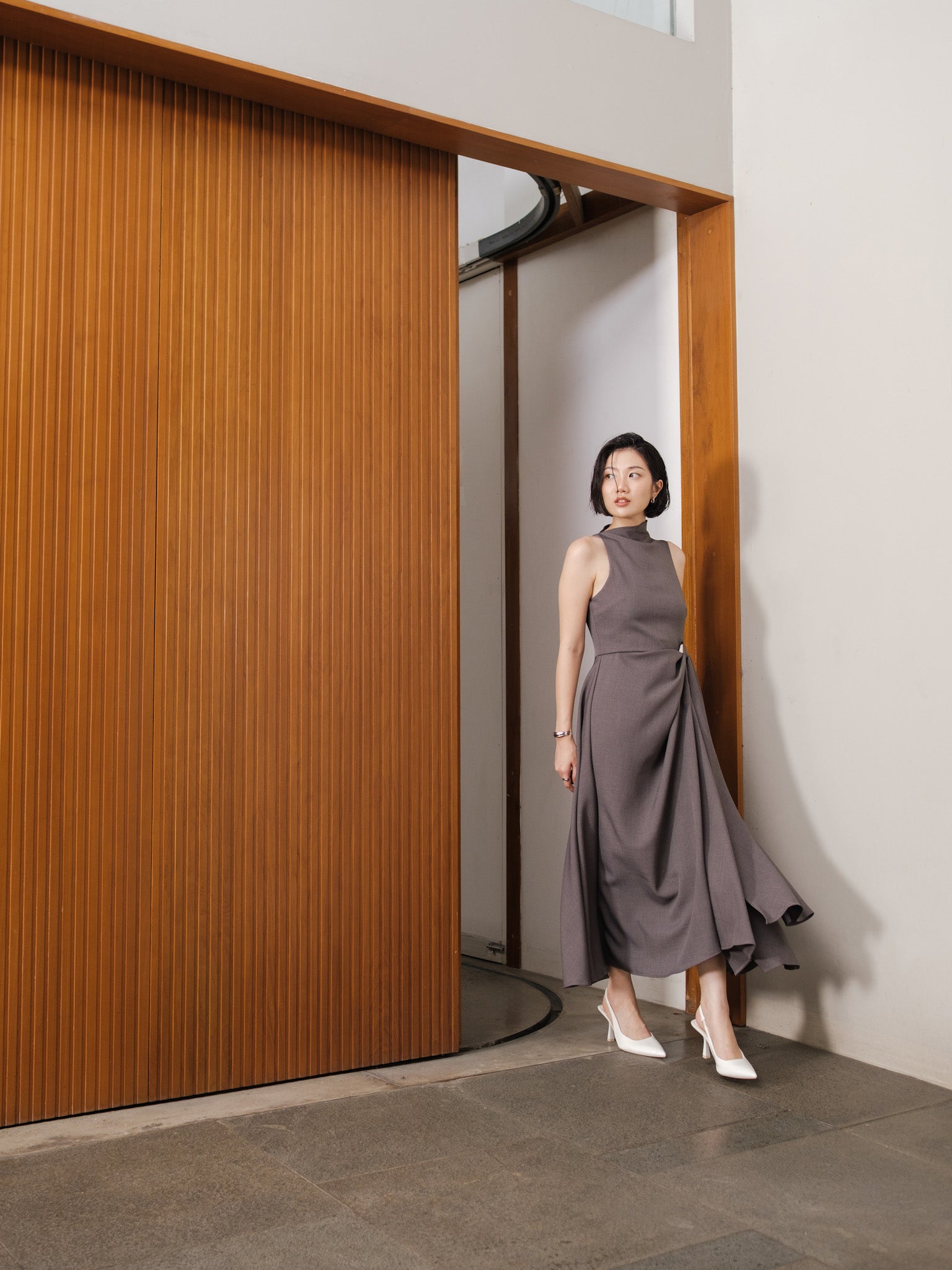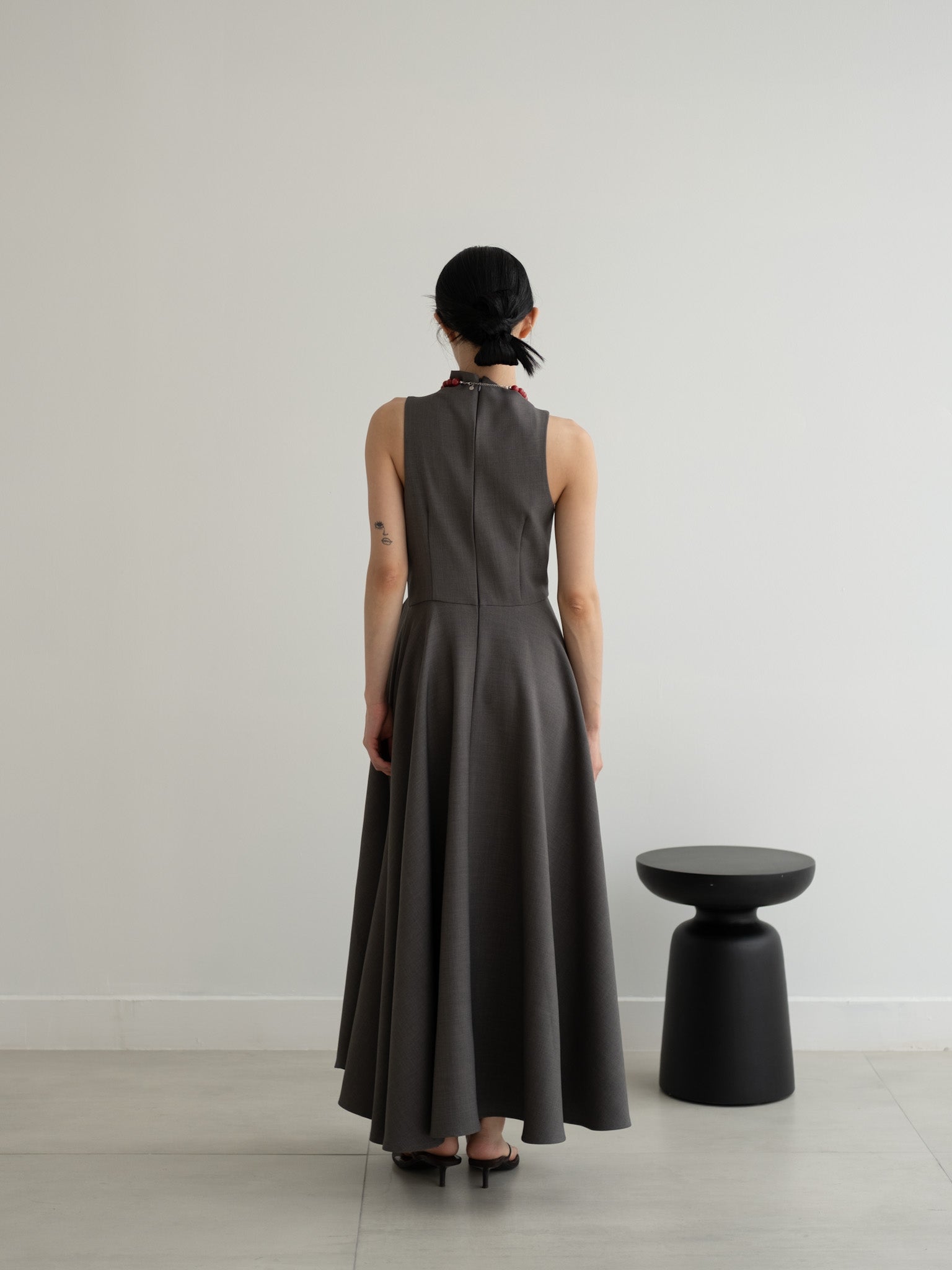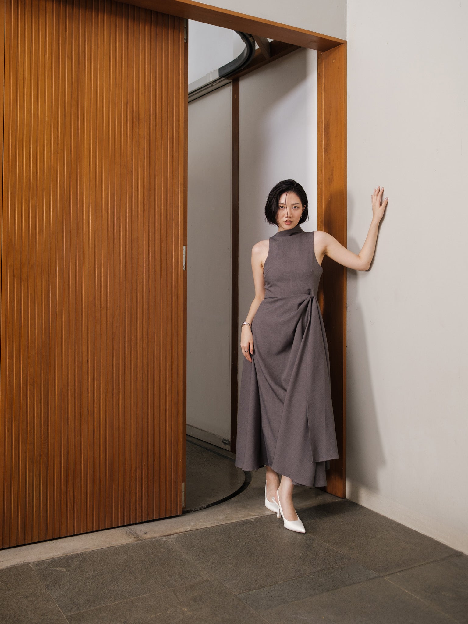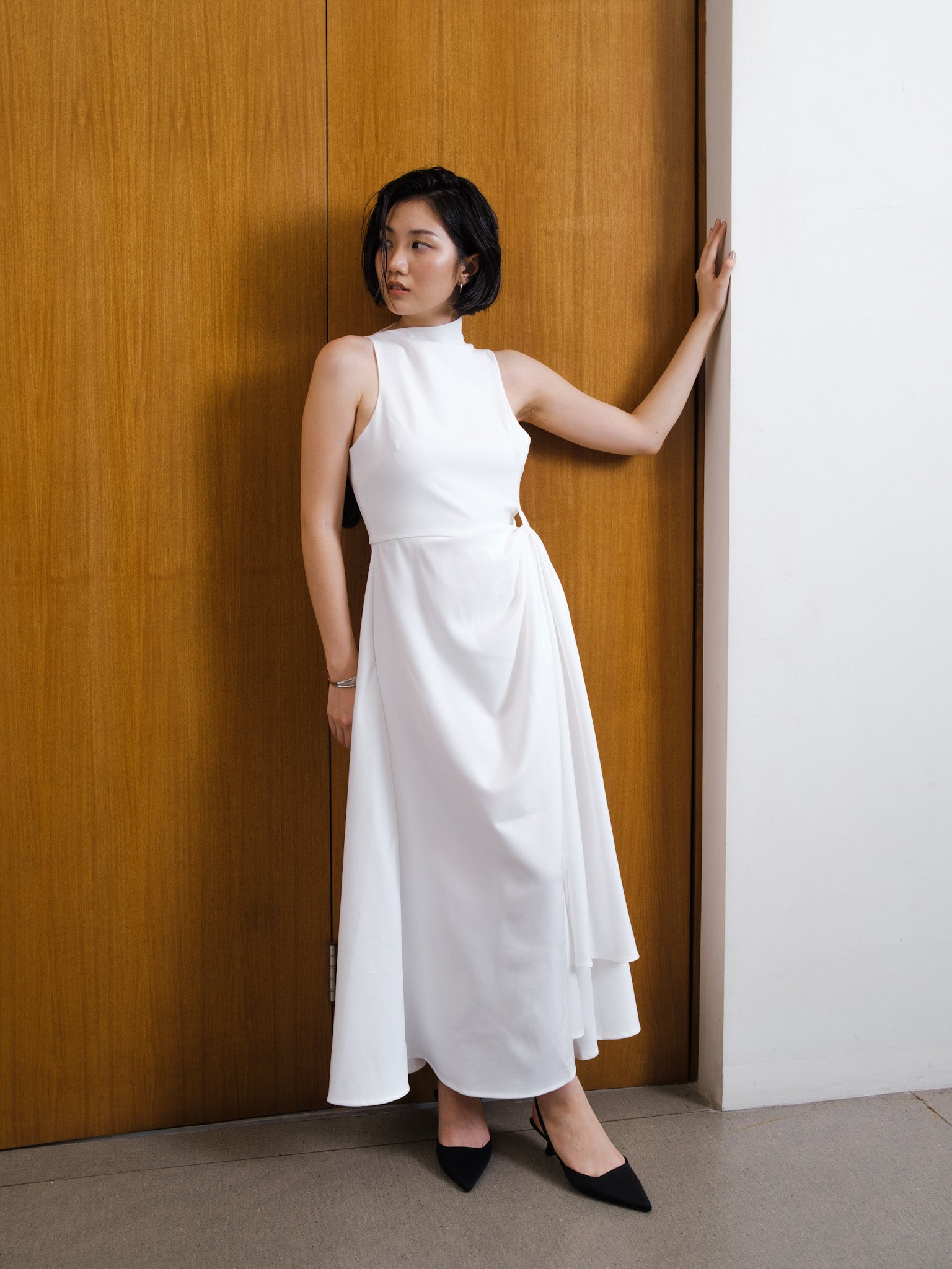 Sleeveless midi dress with high collar, side skirt drape detail, and flared hemline