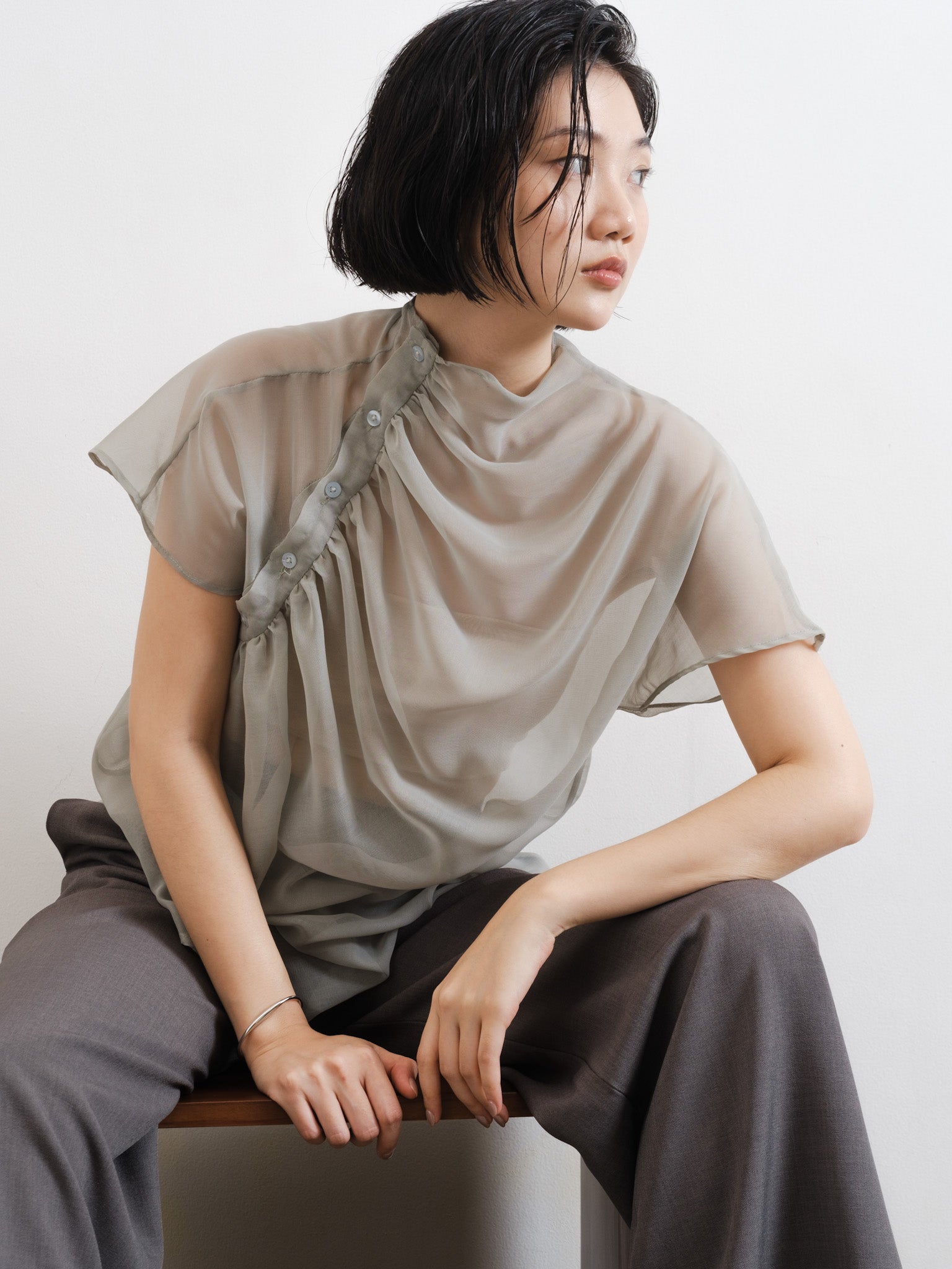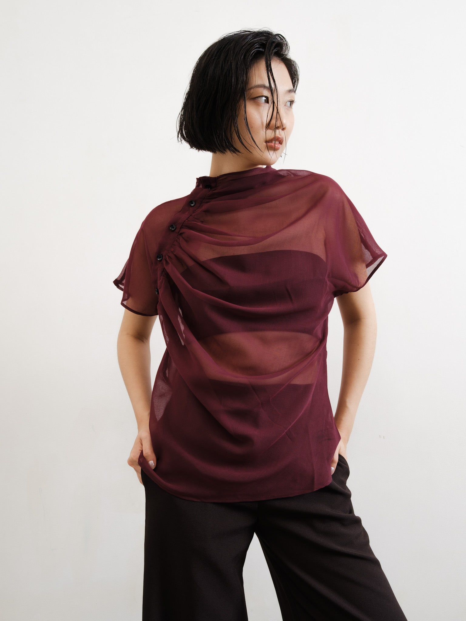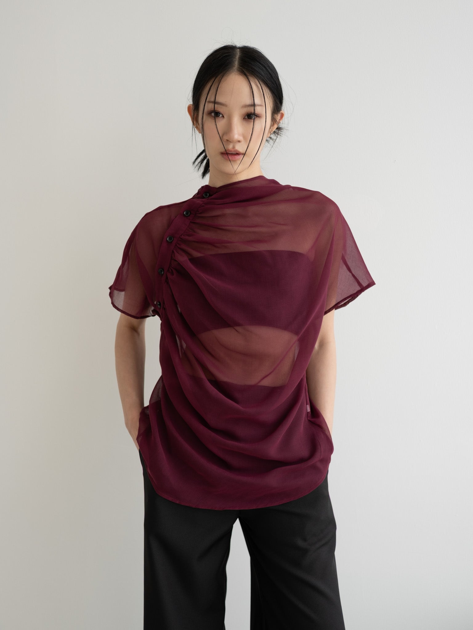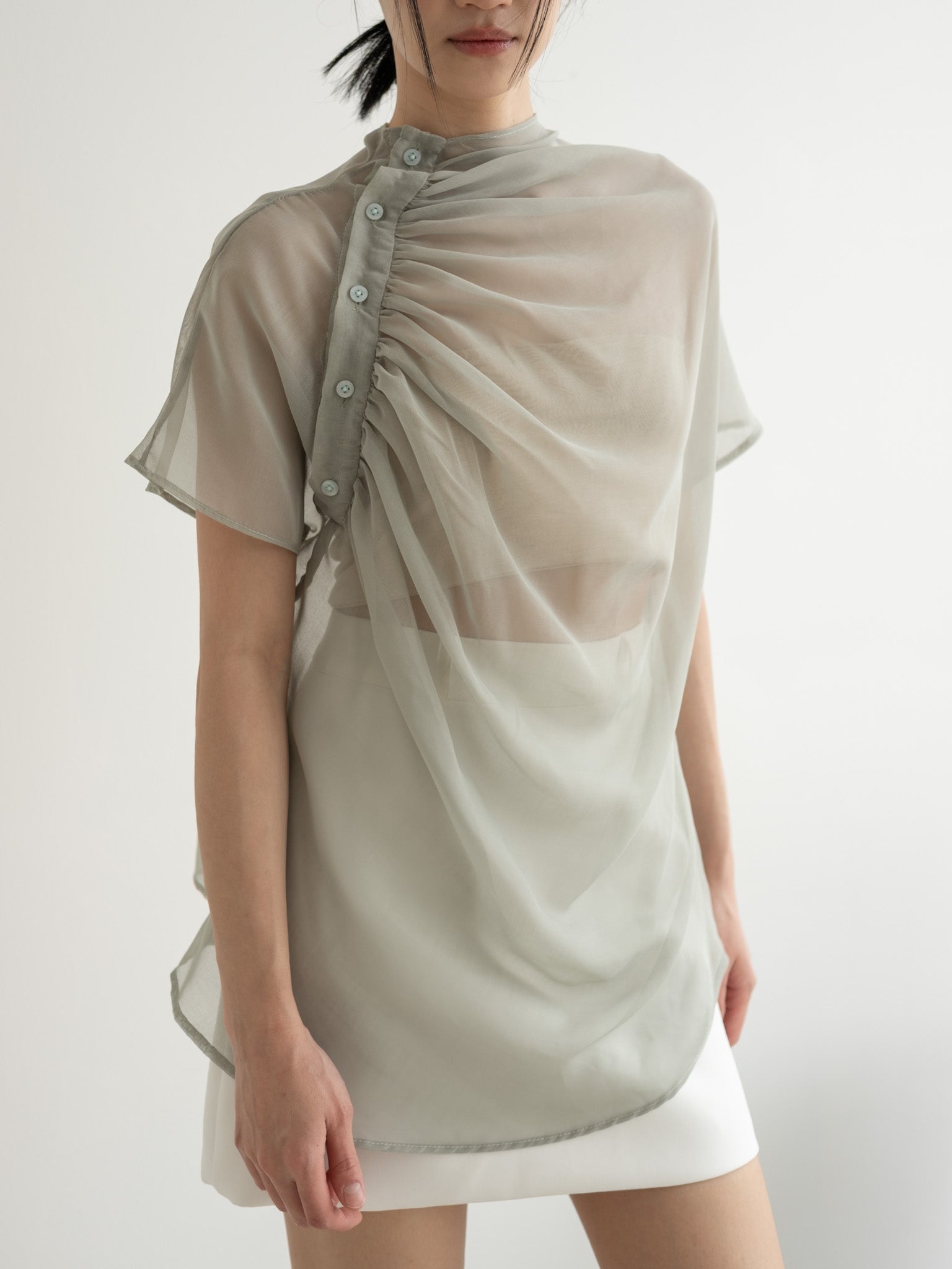 Relaxed sheer top with gathered neckline and shoulder side button detail.