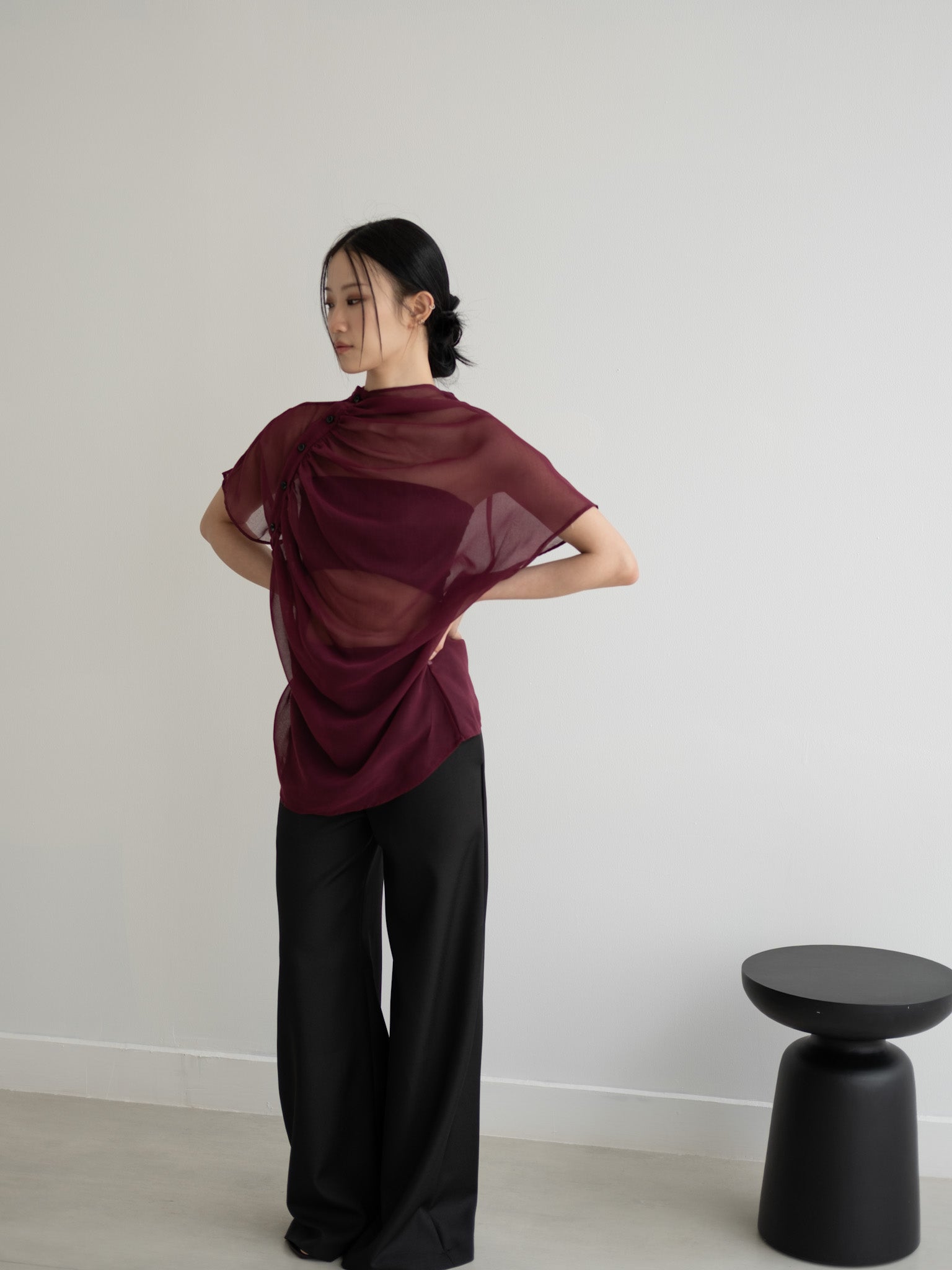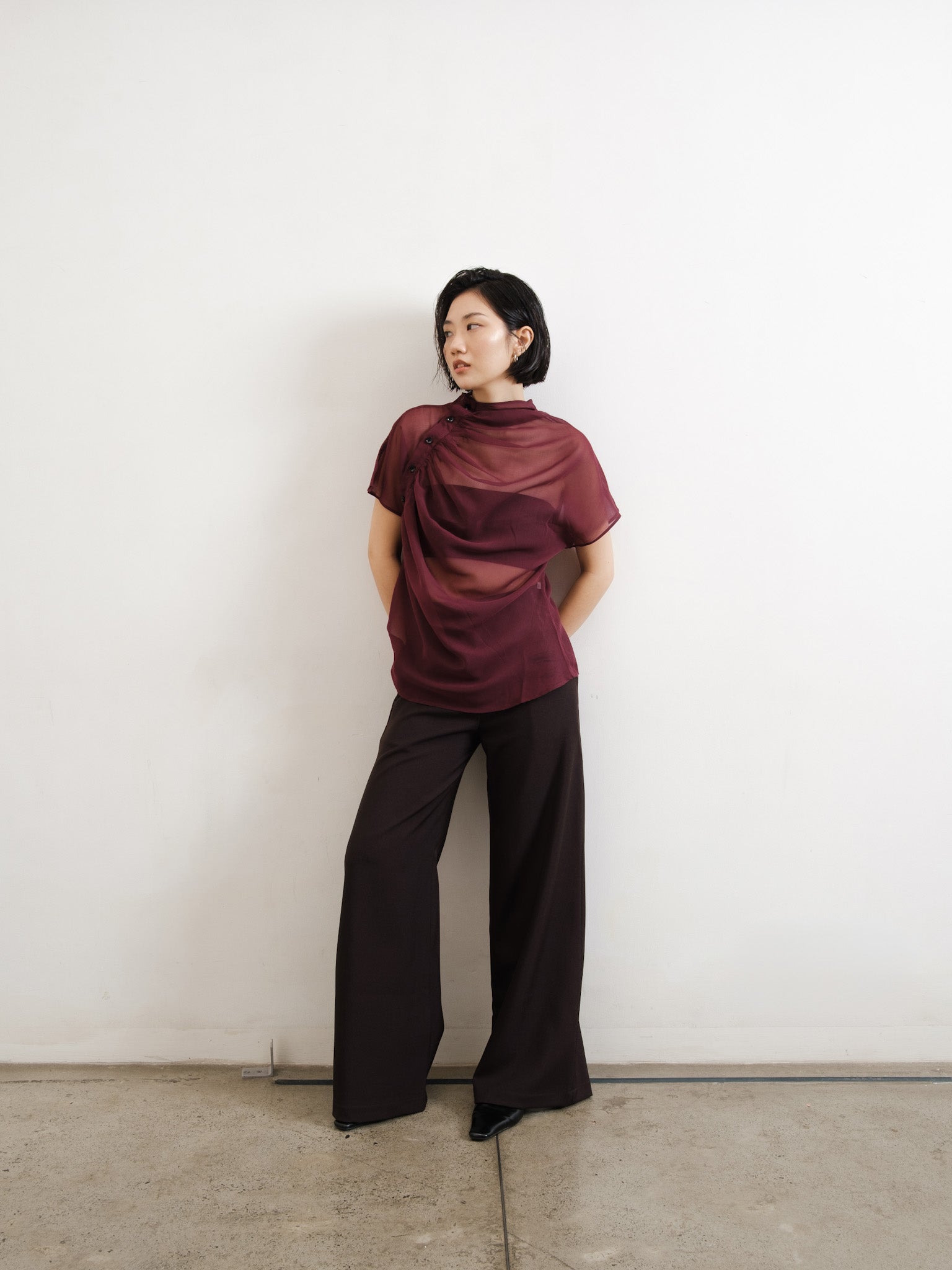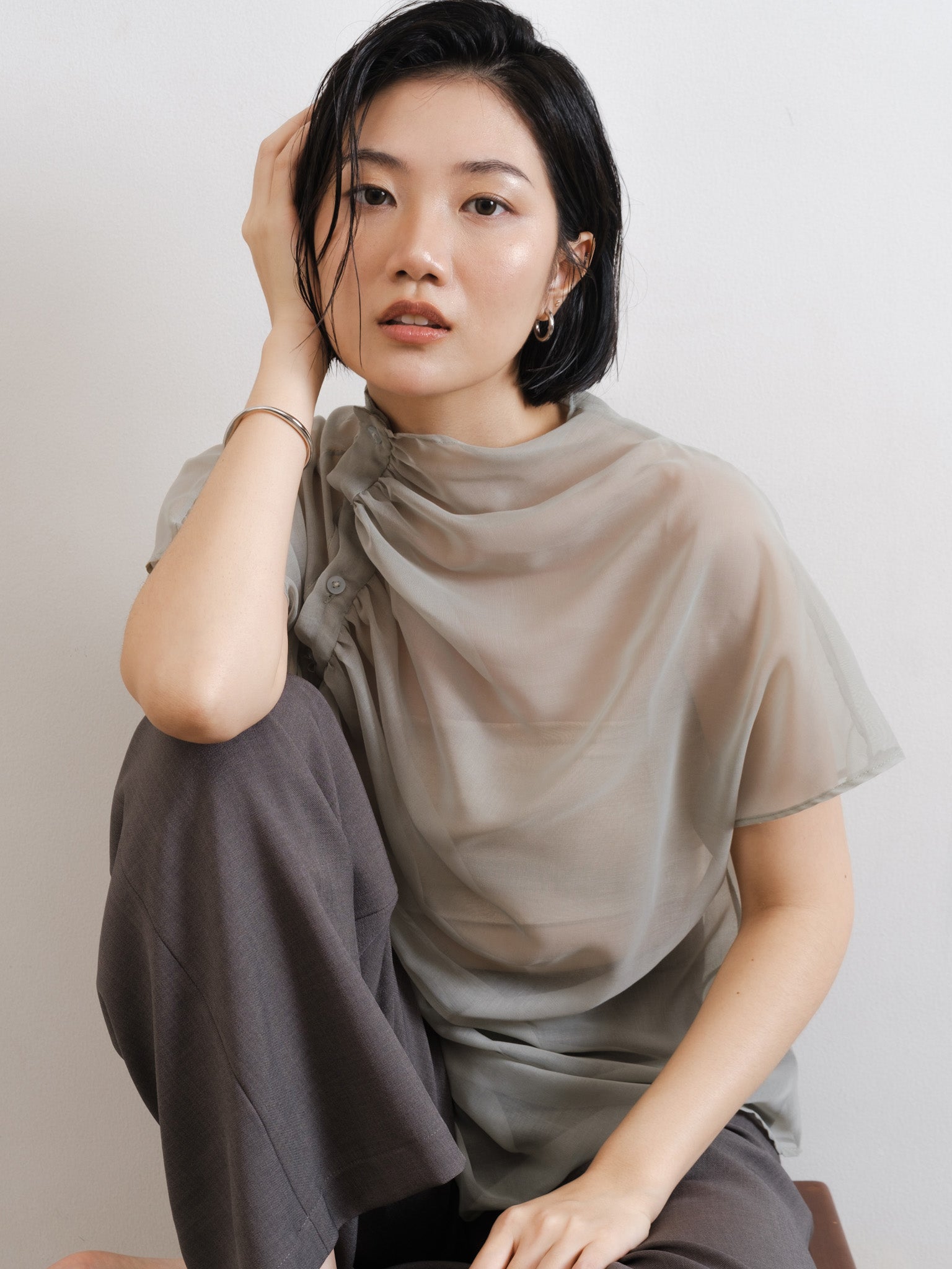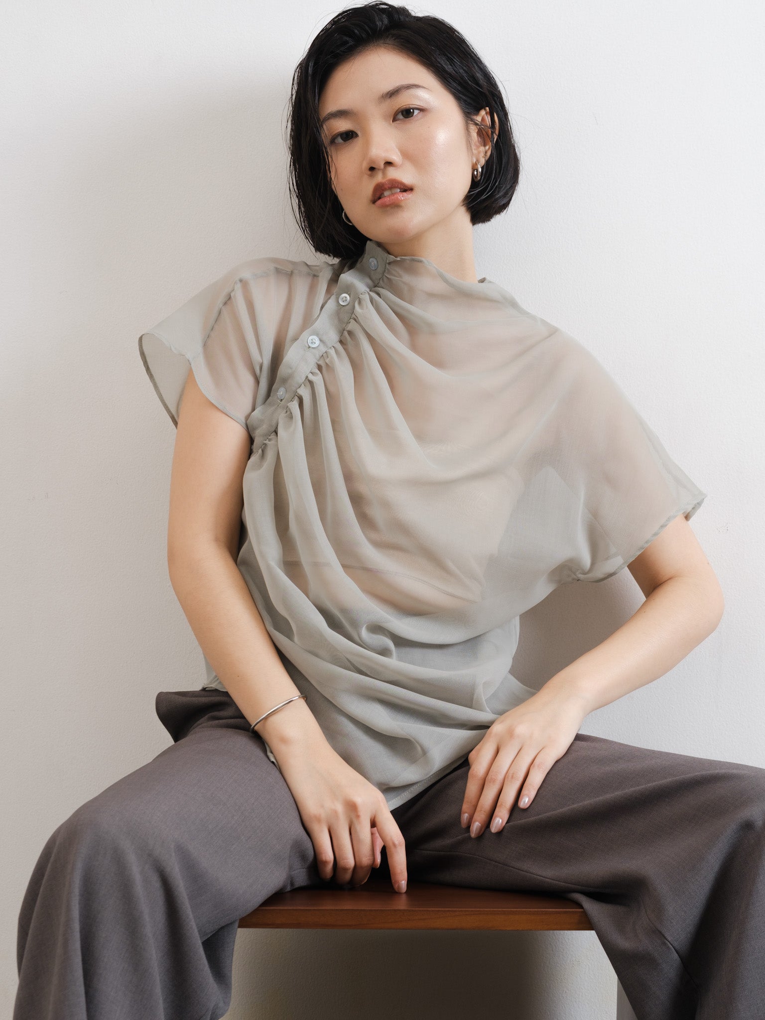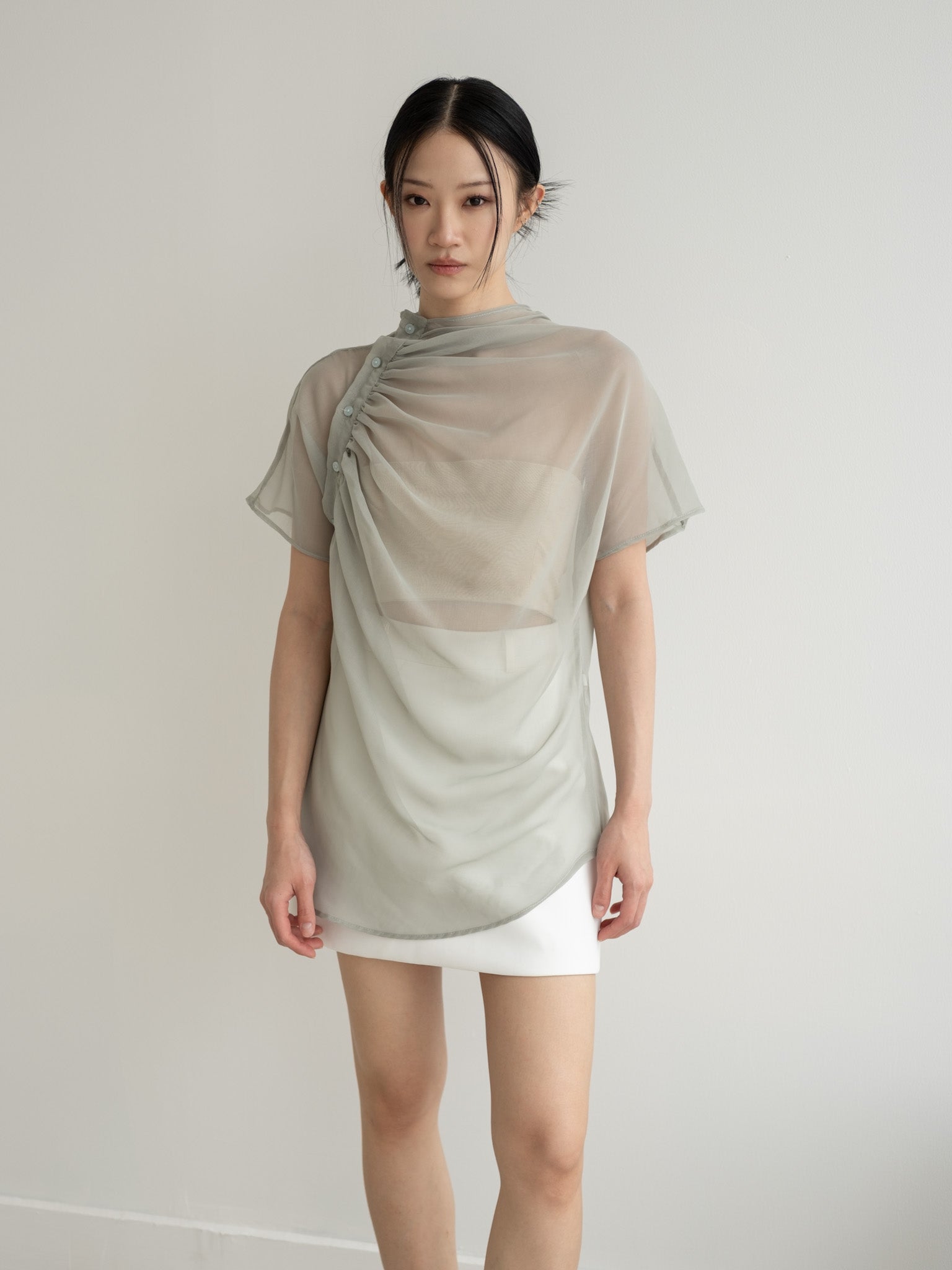 Relaxed sheer top with gathered neckline and shoulder side button detail.