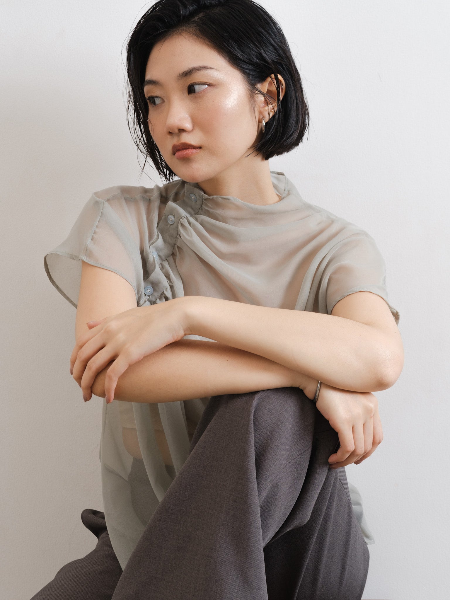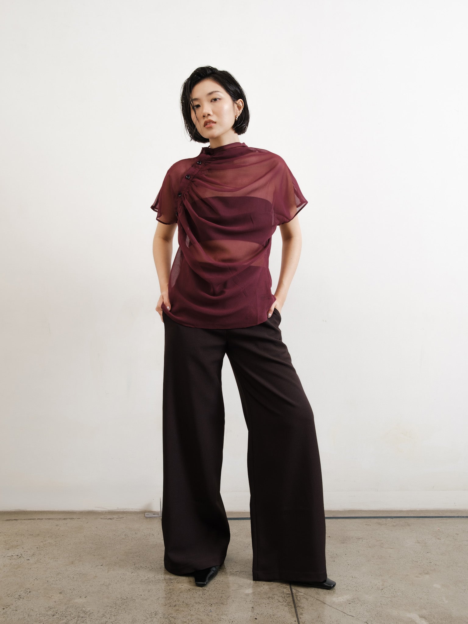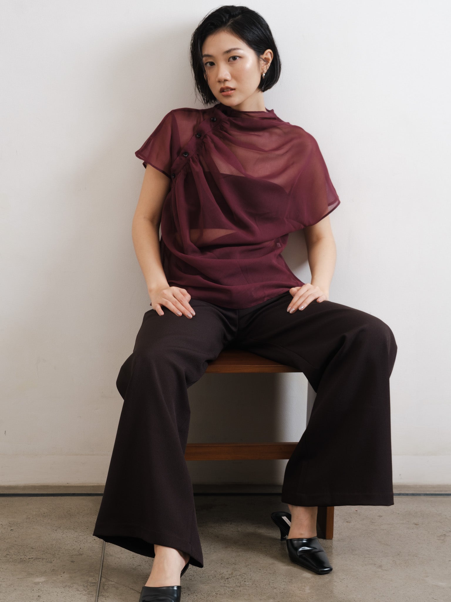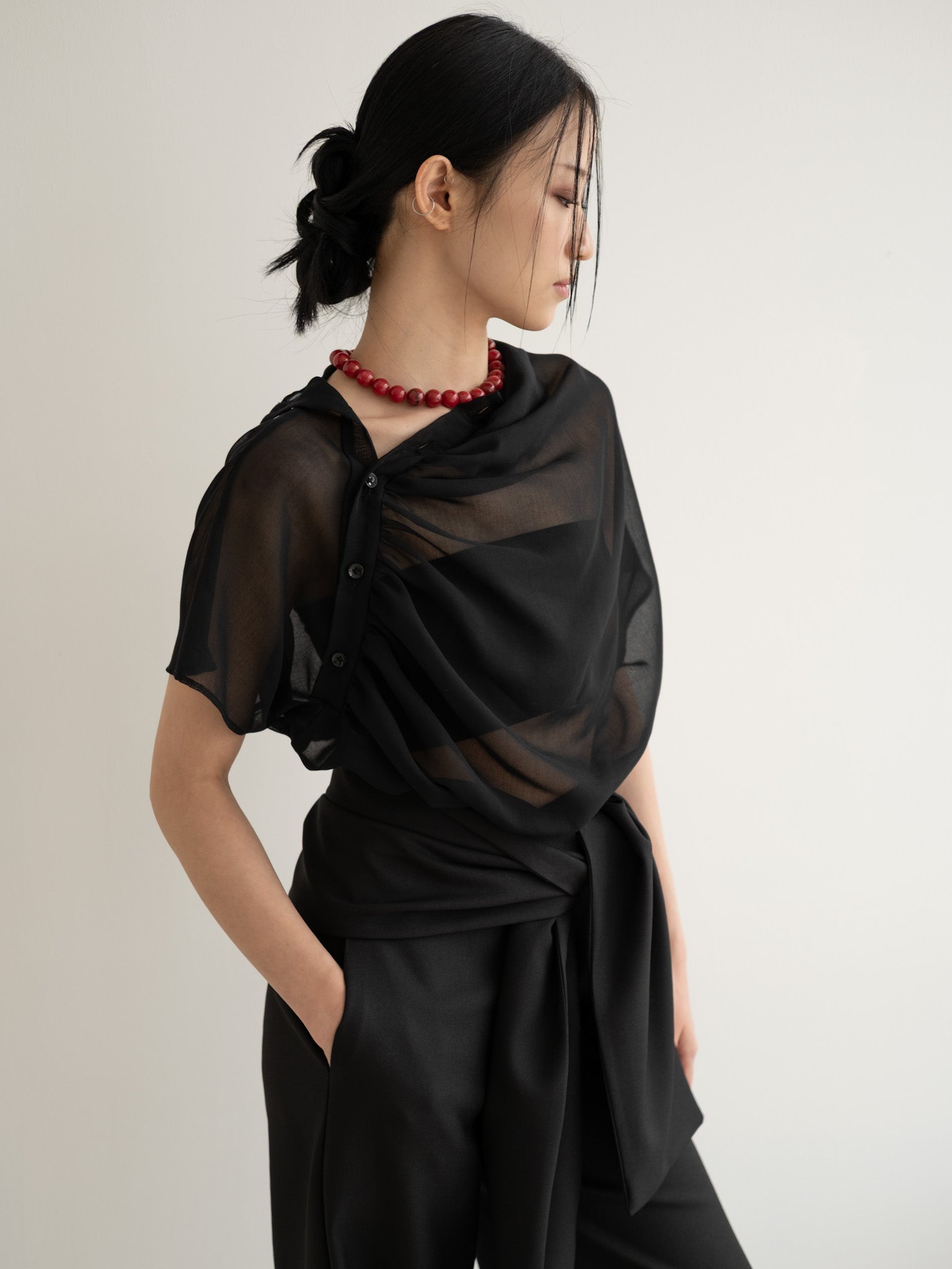 Relaxed sheer top with gathered neckline and shoulder side button detail.