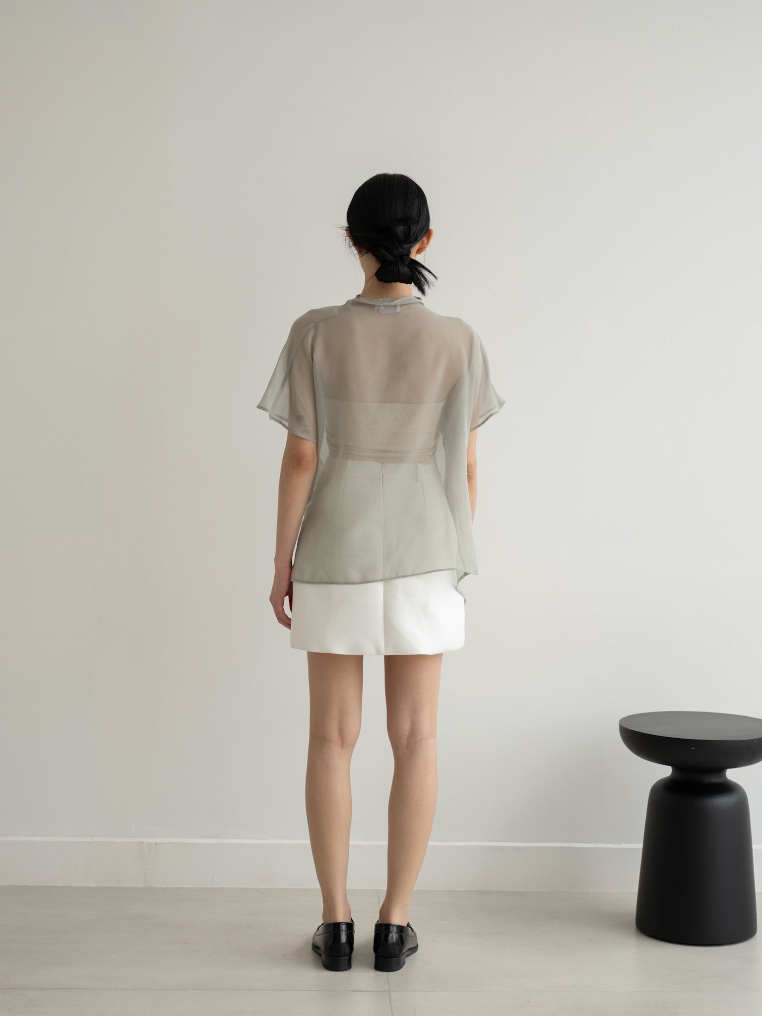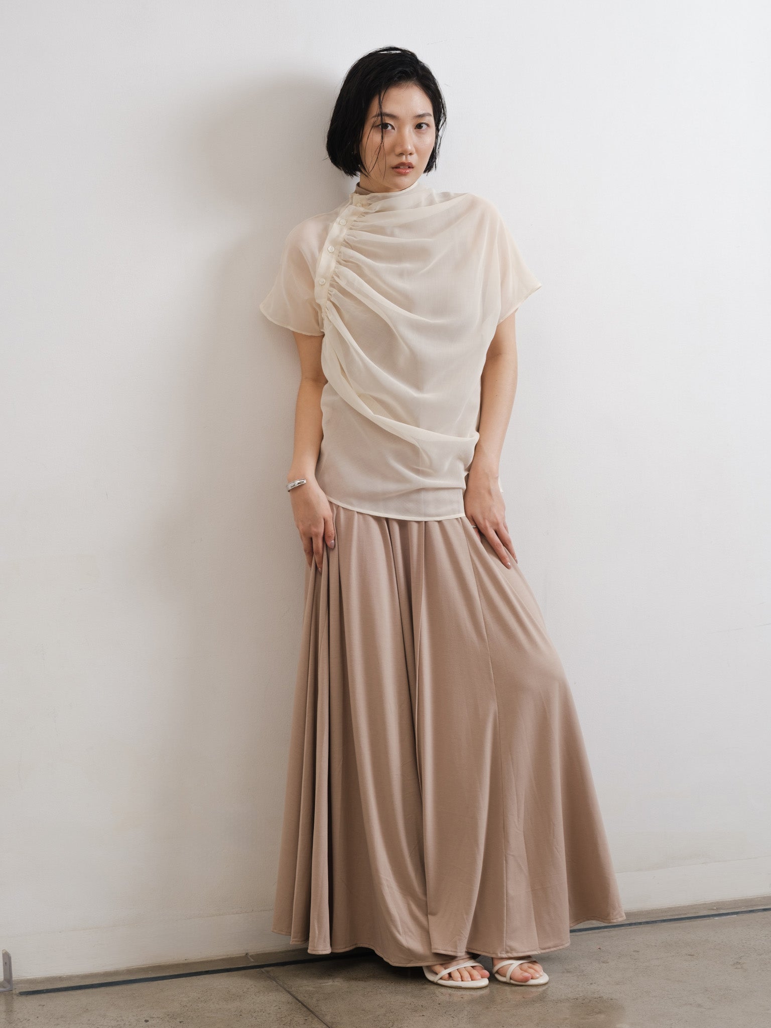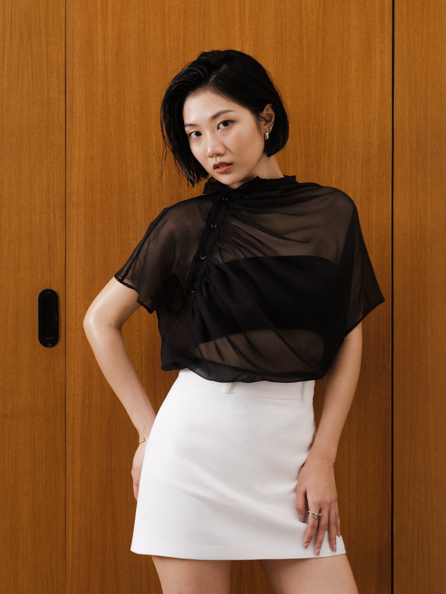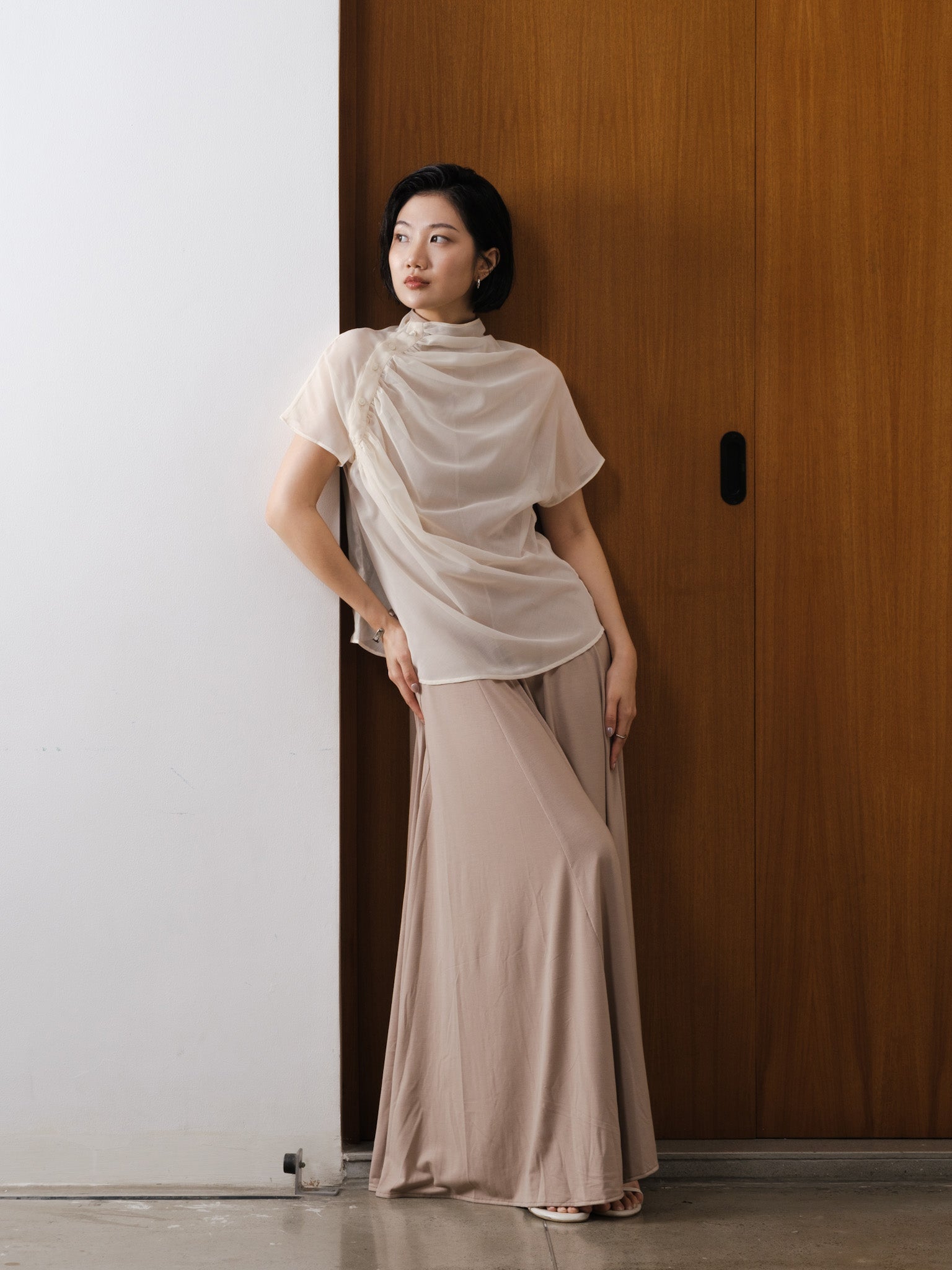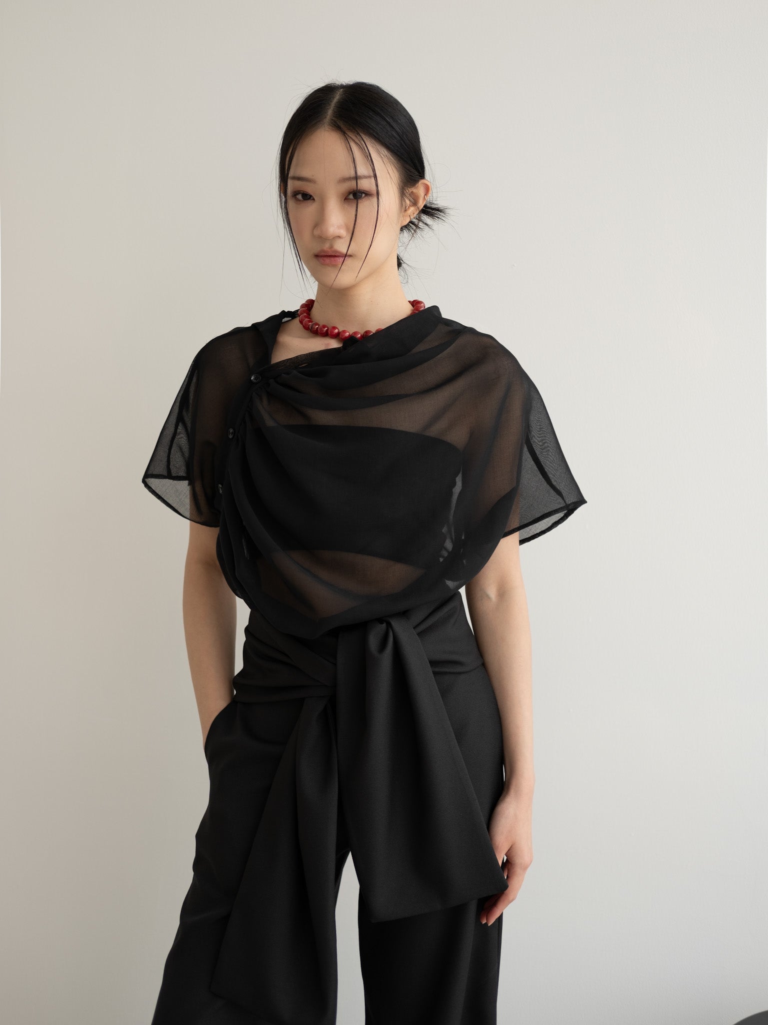 Relaxed sheer top with gathered neckline and shoulder side button detail.