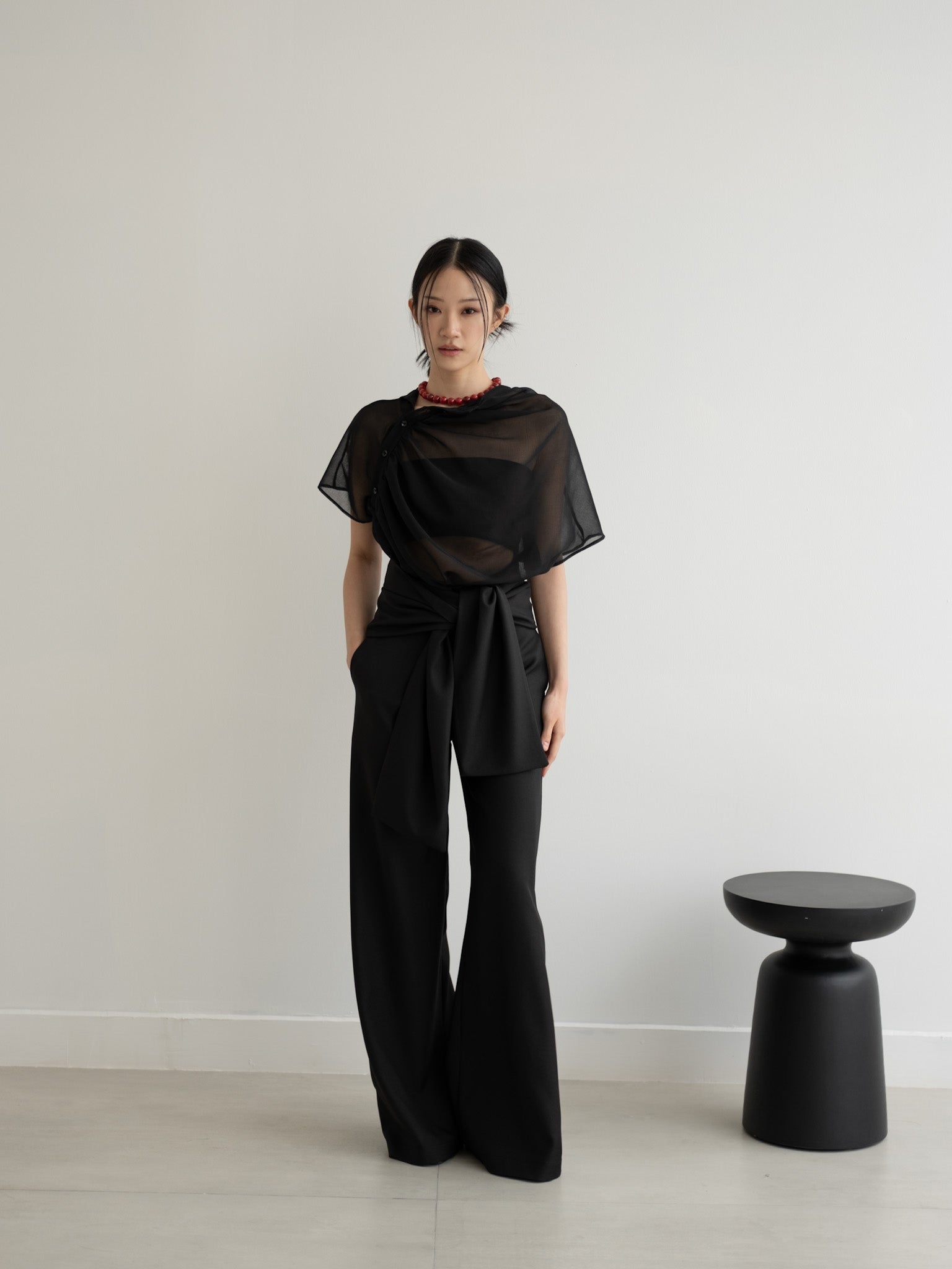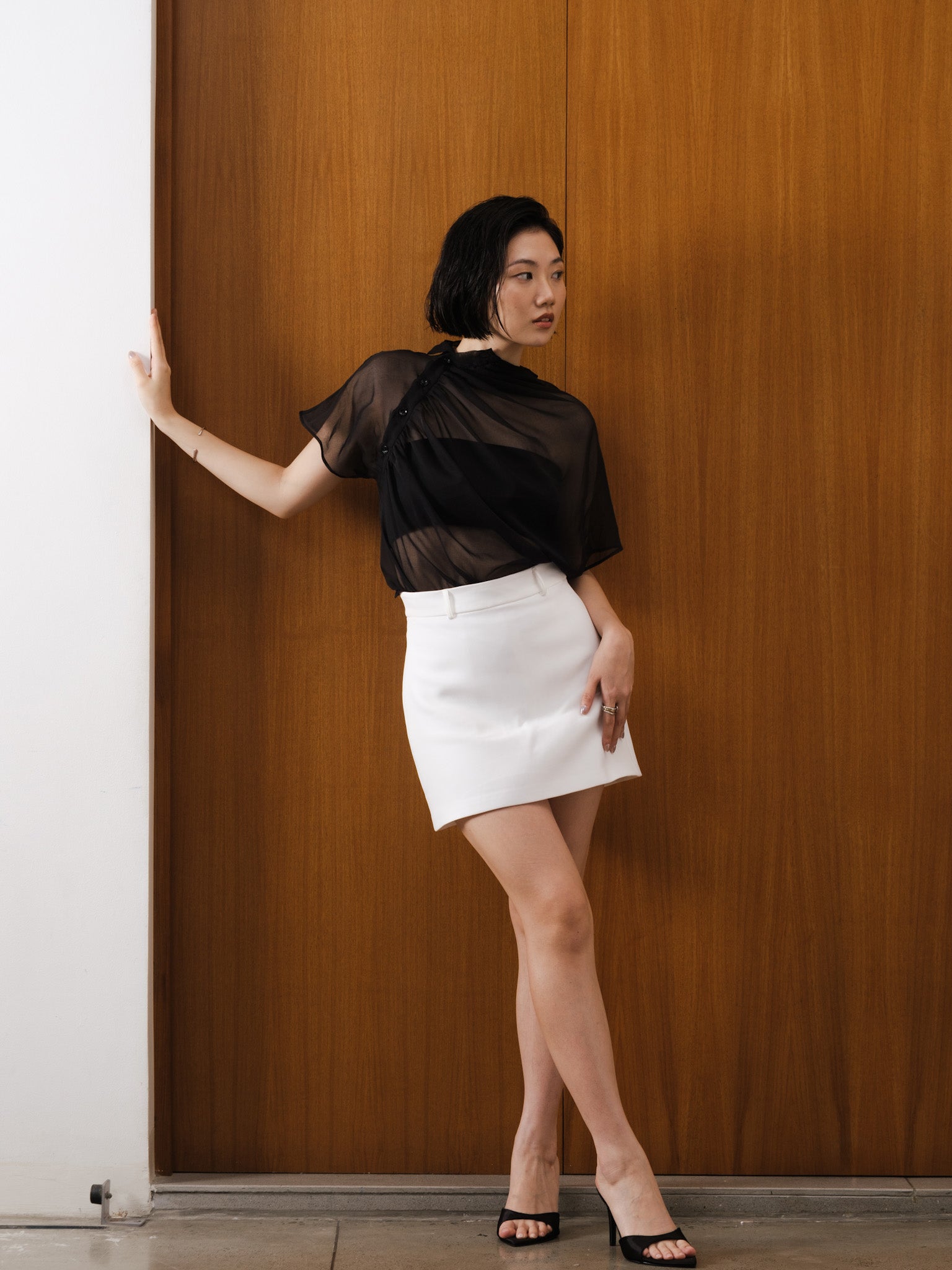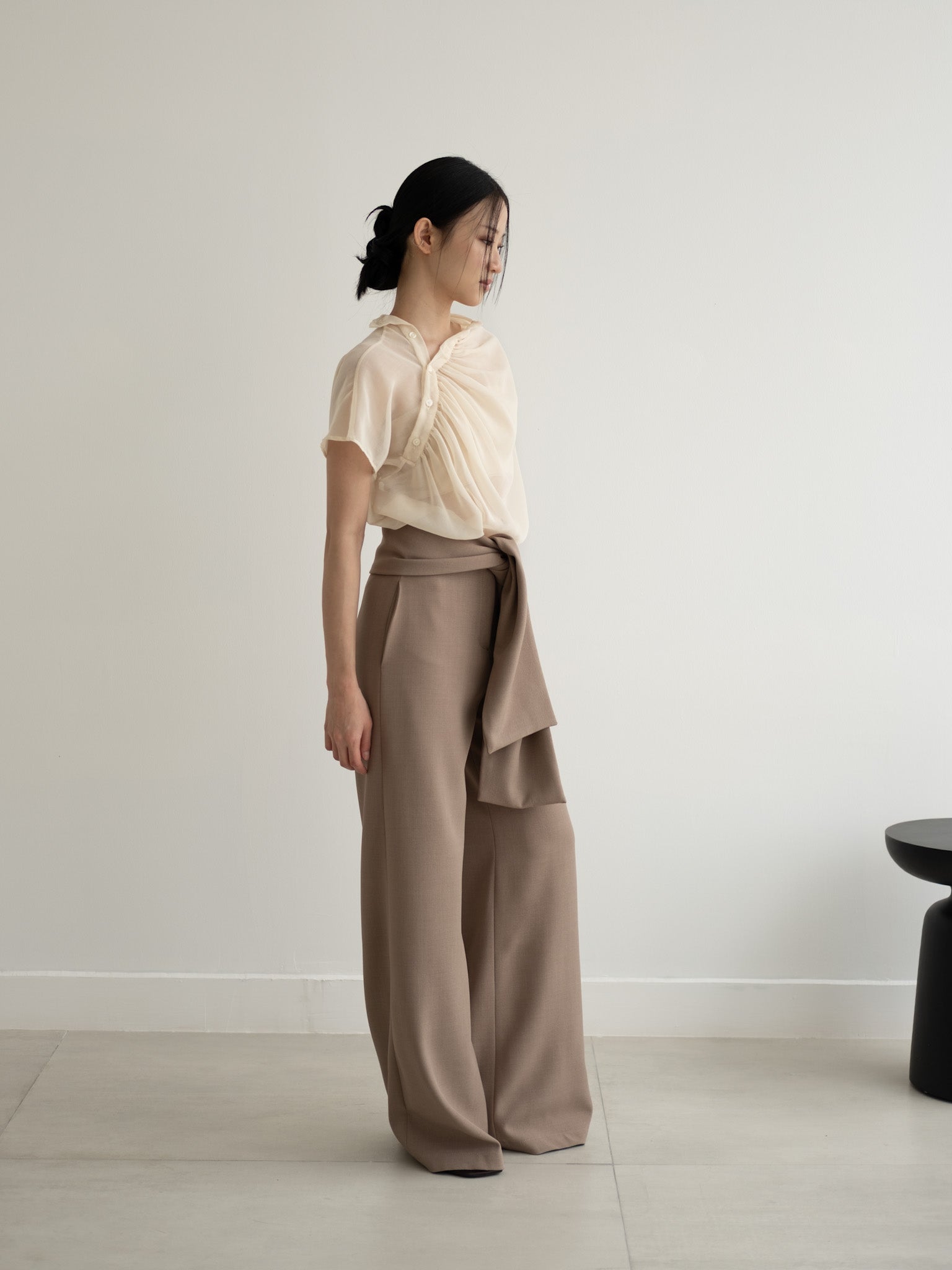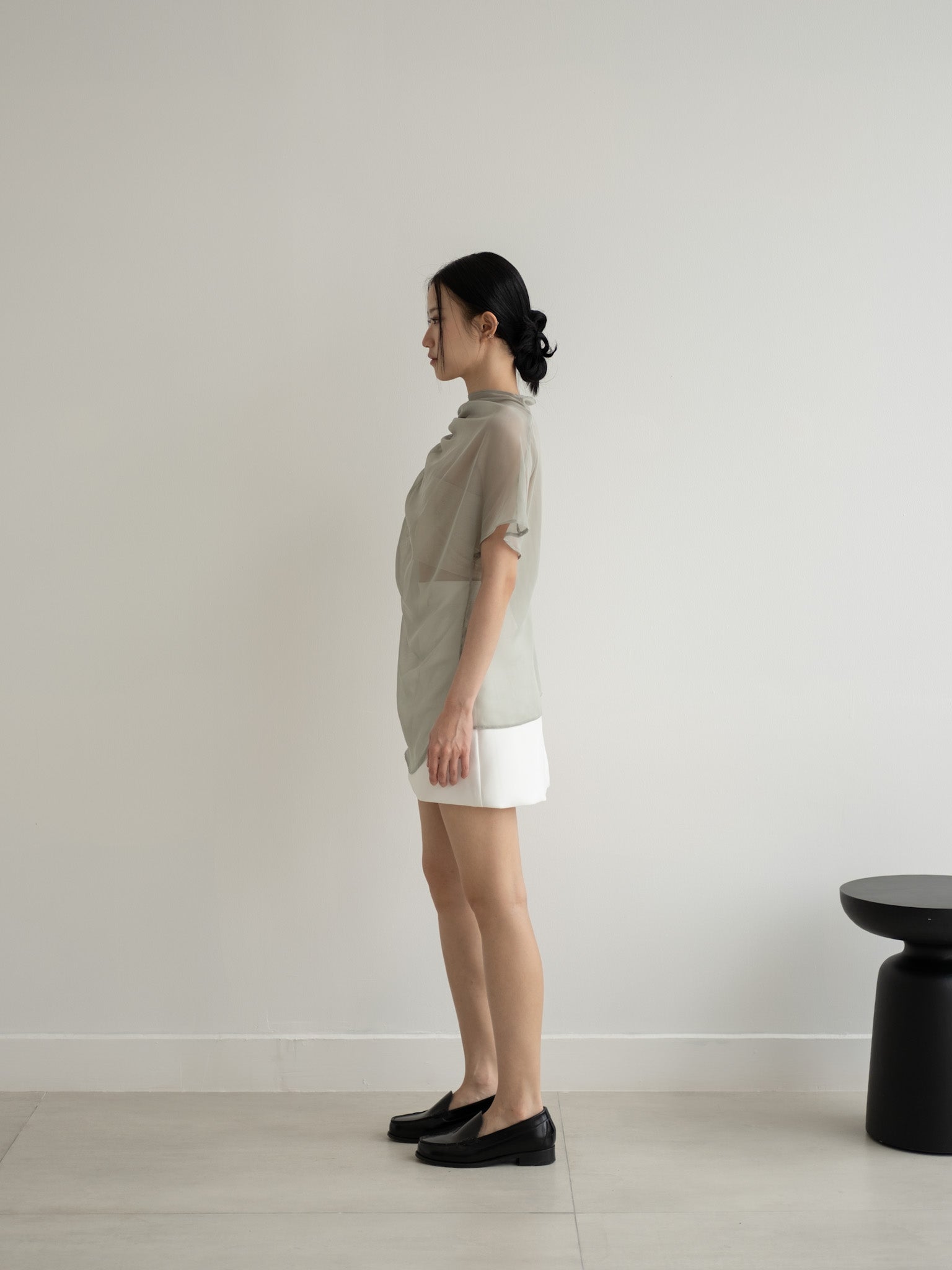 Relaxed sheer top with gathered neckline and shoulder side button detail.