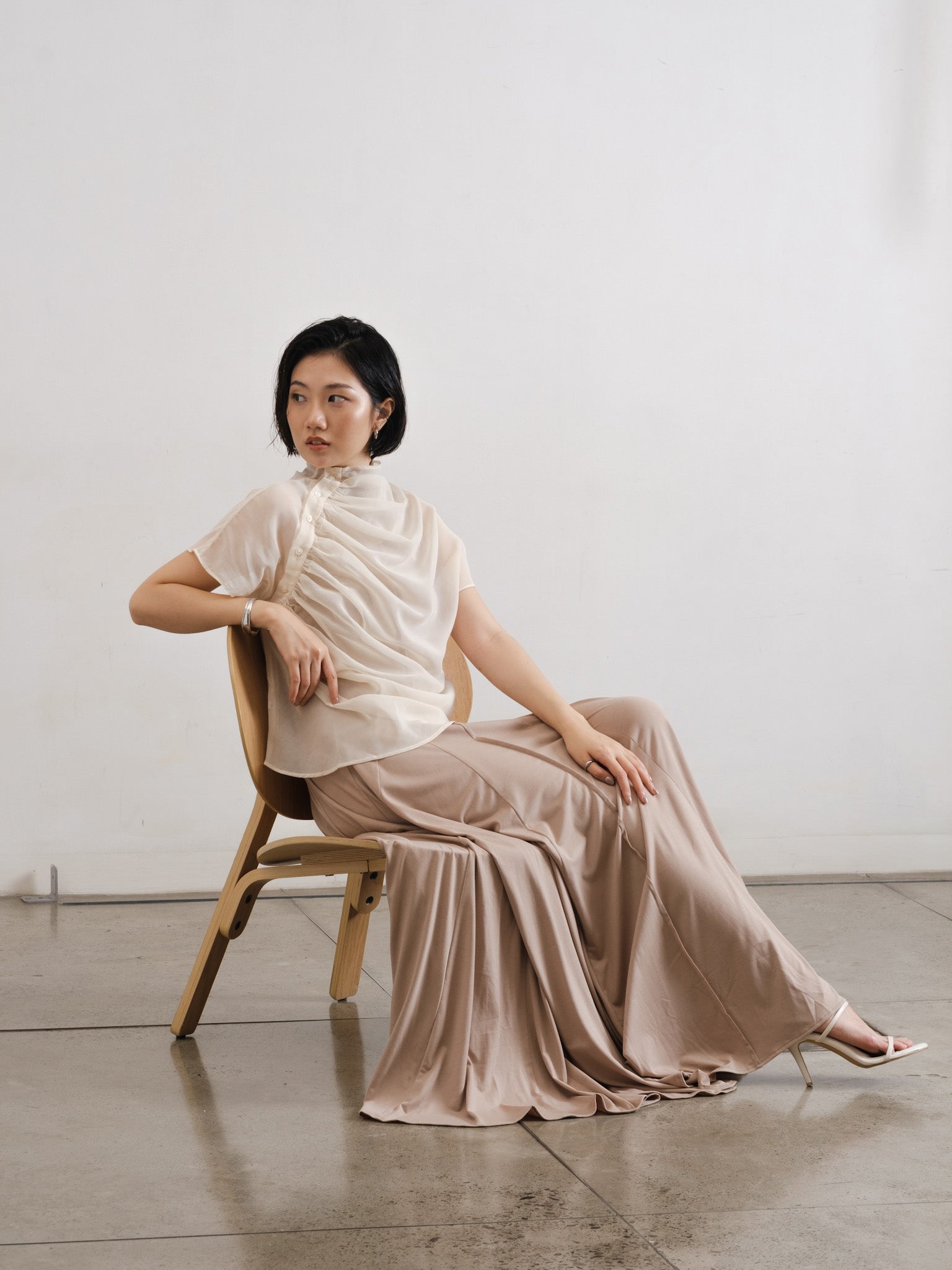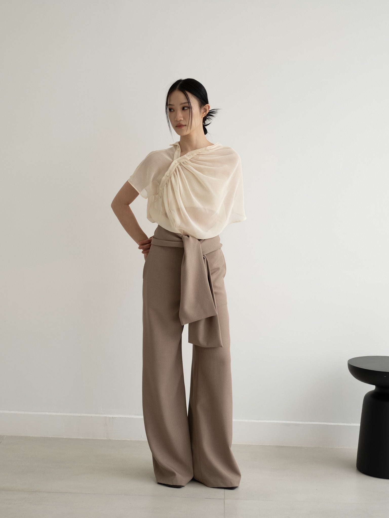 - Asymmetrical buttons and ruffle details